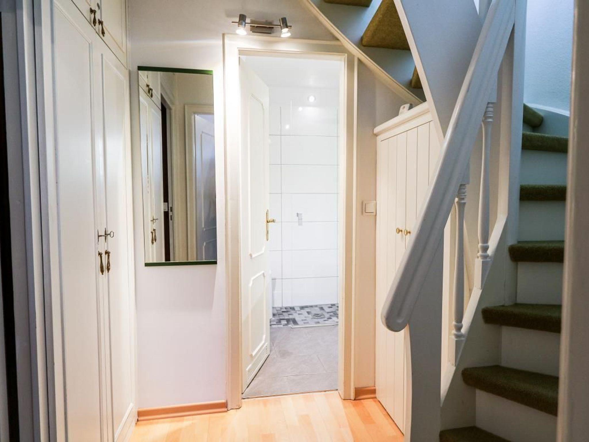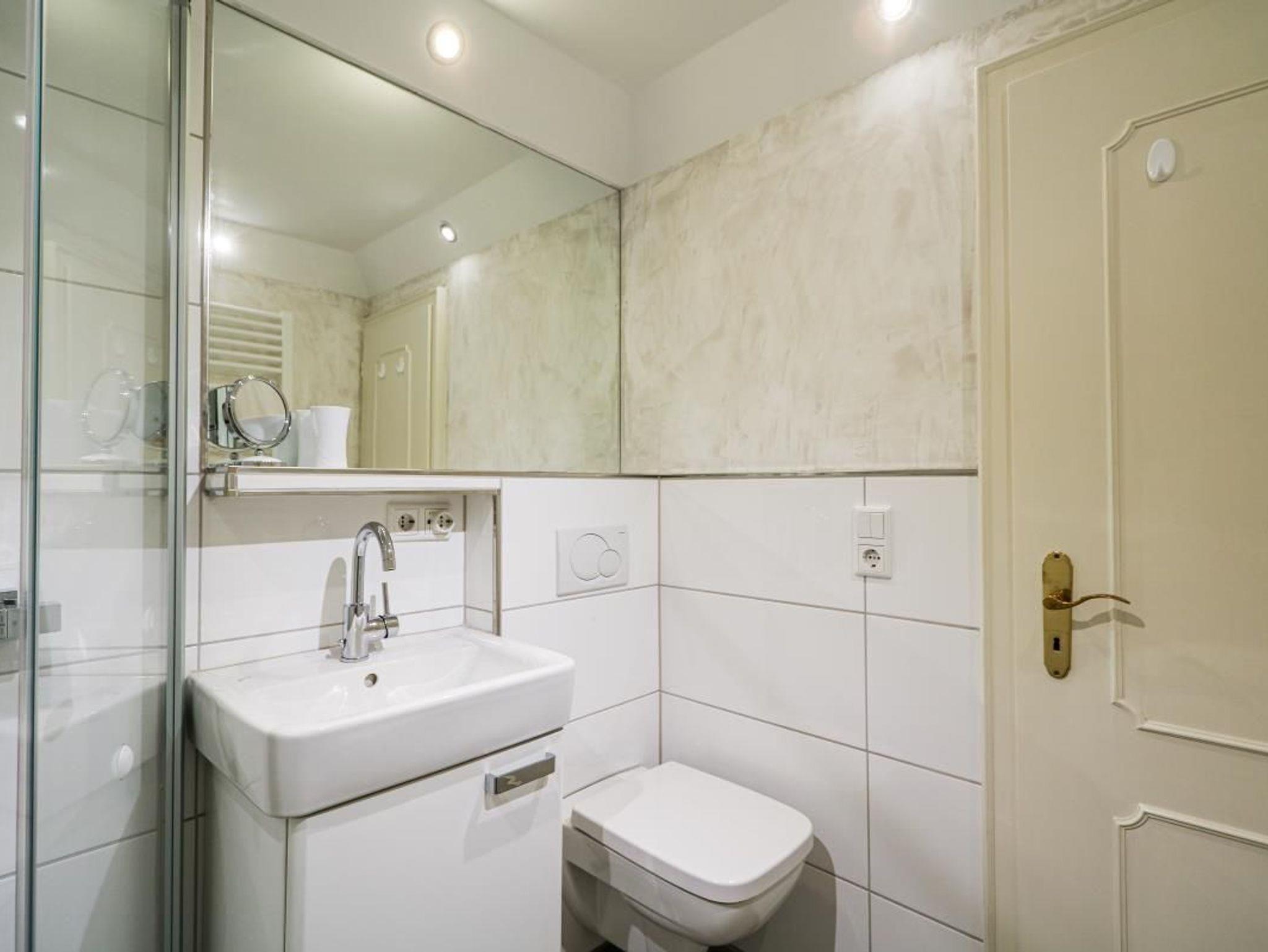 WC, Dusche, Waschtisch, Heizung, Spiegel. Ausreichend Handtücher und Vorleger.