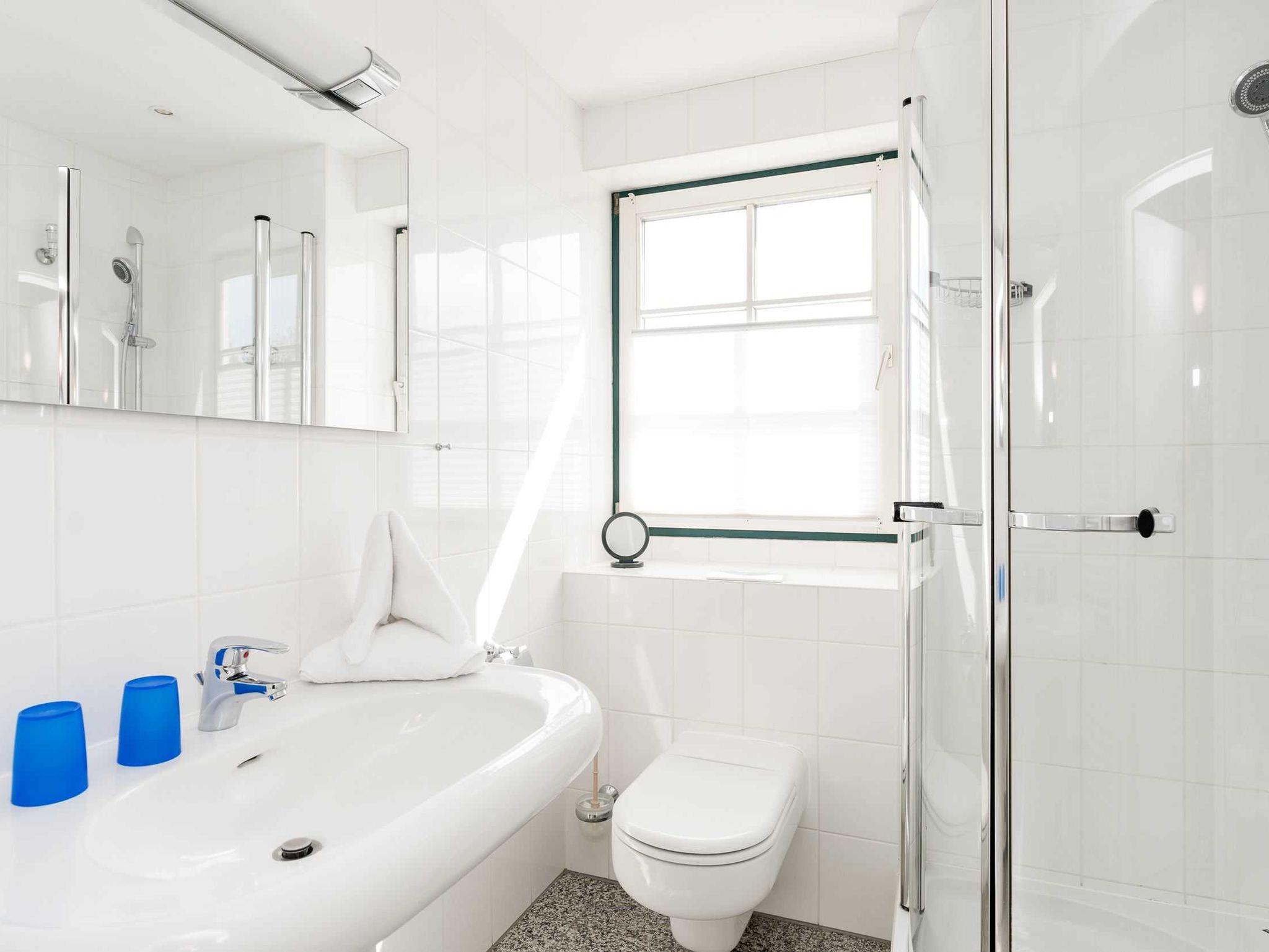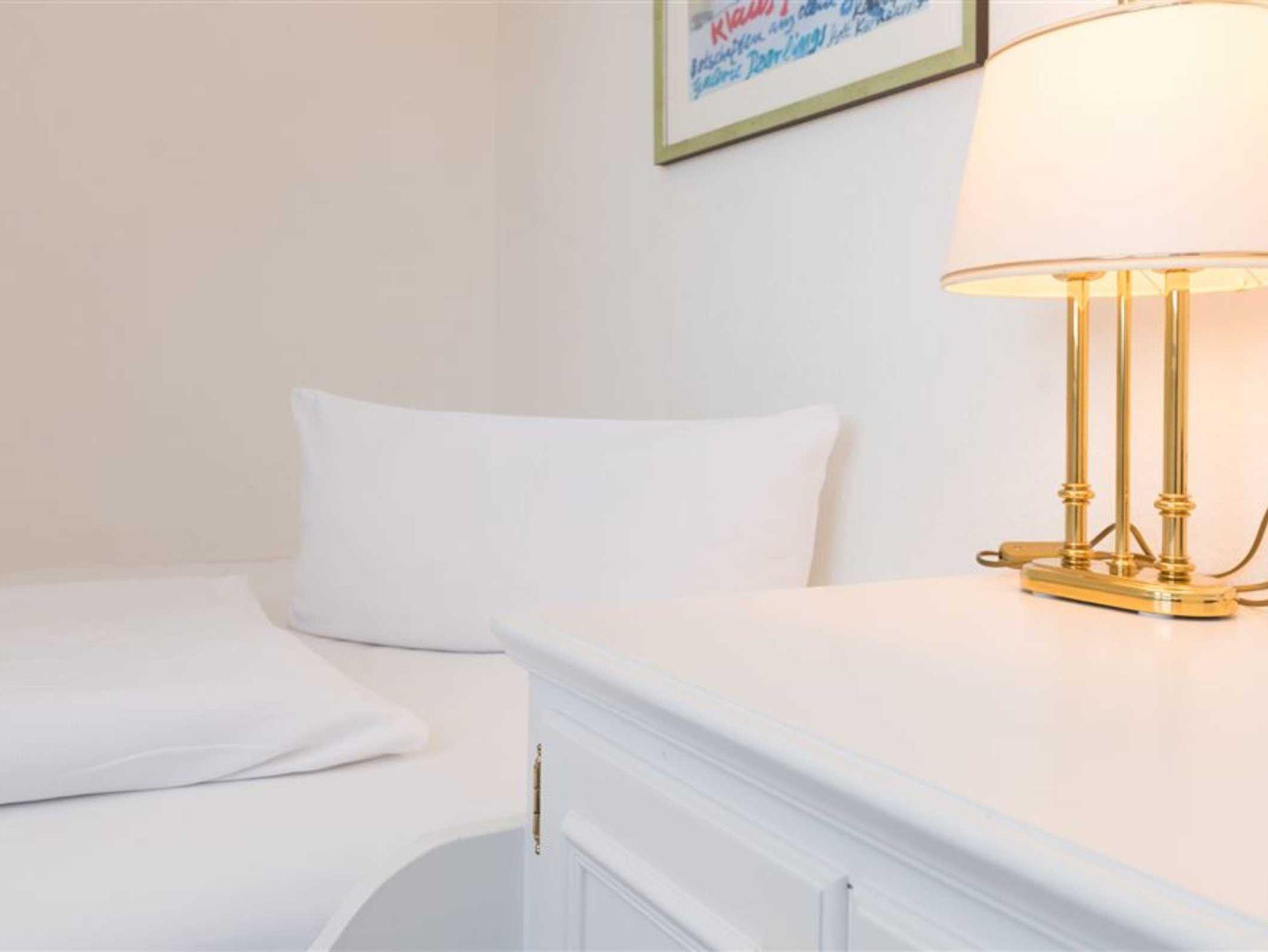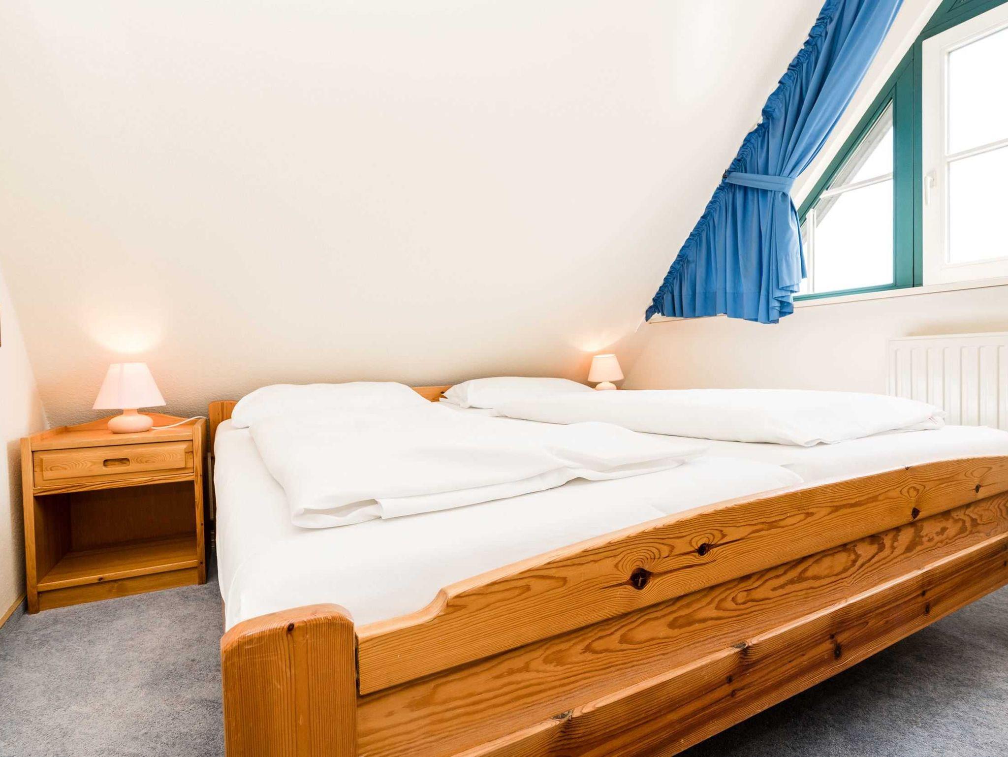 Die Unterkunft verteilt sich über 1. OG und DG. Im 1. OG. finden Sie das lichtdurchflutete Badezimmer, einen Schlafraum mit eingebautem großen Bett und einem Einbauschrank. Der Blick aus diesem Zimmer zeigt am Horizont den Kampener Leuchtturm.