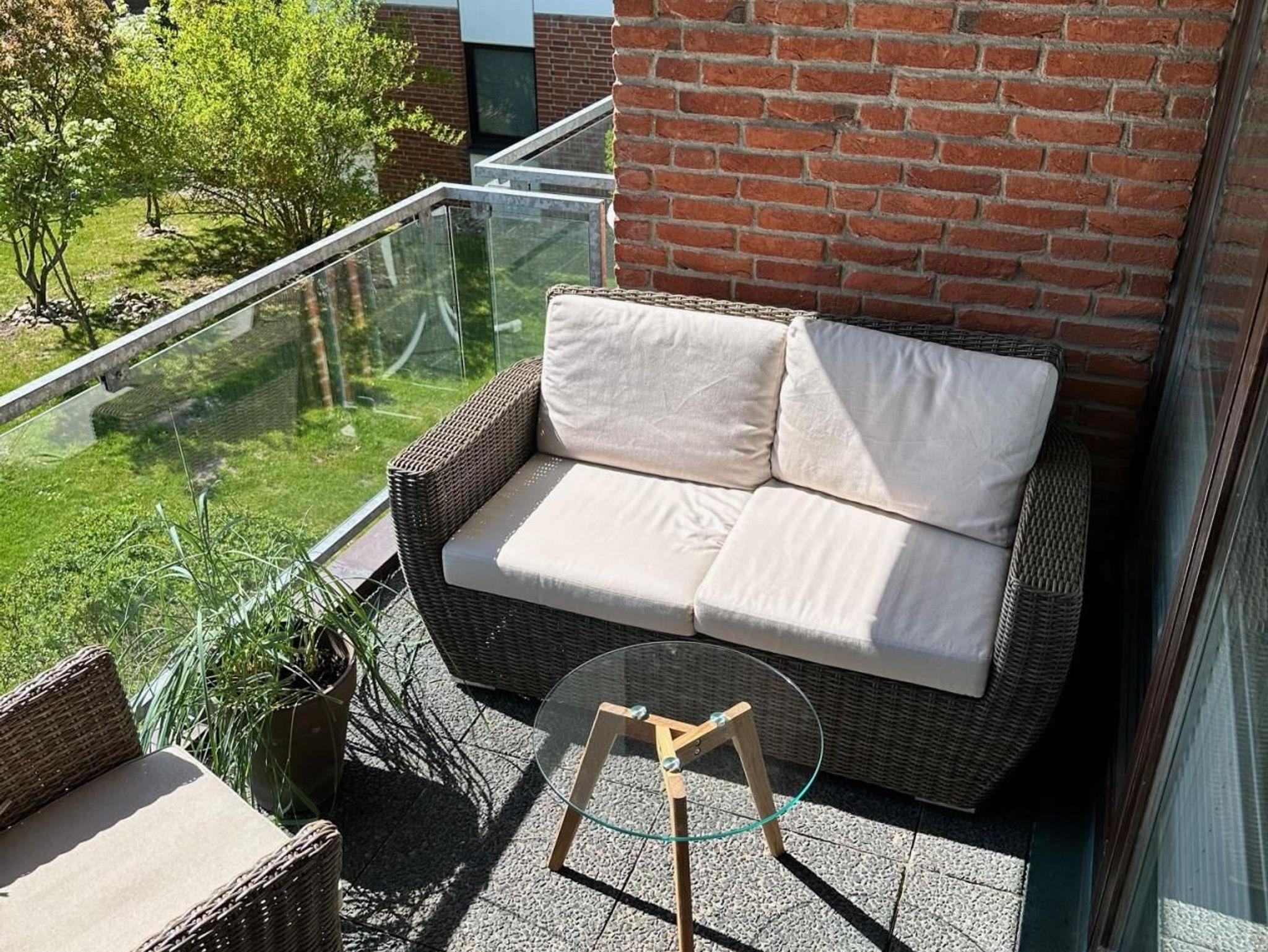 Sie haben direkten Zugang zum sonnigen Balkon in Südausrichtung, ausgestattet mit Gartenmöbel.