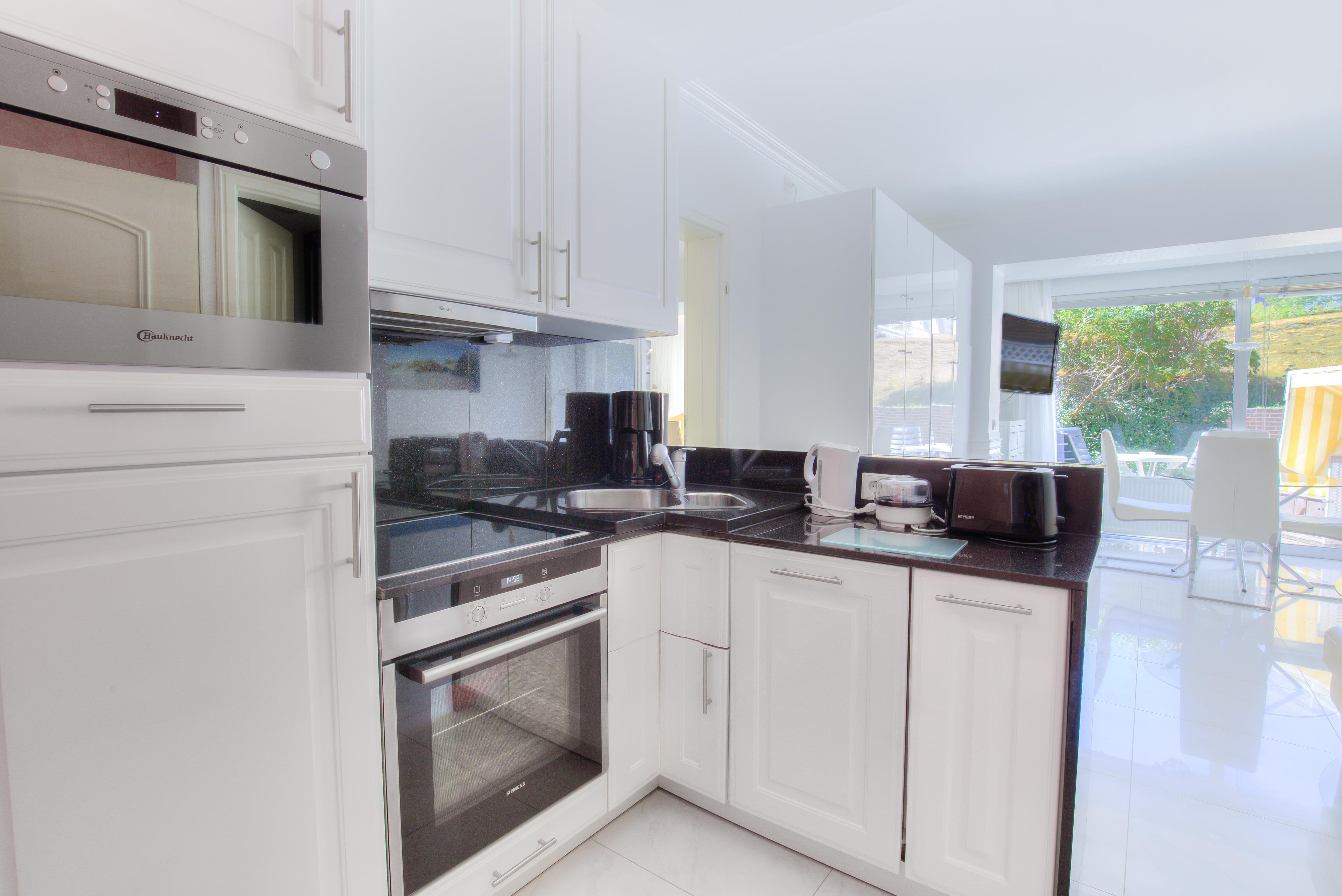 Erleben Sie einen komfortablen Sylt-Urlaub in dieser hellen, ca. 50 m² großen Ferienwohnung für 2 bis 3 Personen. Das lichtdurchflutete, schöne Wohnzimmer mit 2 Schrankbetten lädt mit hochwertigen Polstern und einem Essplatz mit Blick auf die Terrasse zum gemütlichen Verweilen ein. Die integrierte, komplett ausgestattete Küche mit Backofen wird Hobbyköchen sehr gefallen. Im schicken Doppelschlafzimmer mit Boxspringbett und TV können Sie behagliche Fernsehabende verbringen und eingekuschelt den nächsten schönen Urlaubstag planen. Die beiden edlen Bäder sind einmal mit einer großen Dusche und einmal mit einem Whirlpool ausgestattet - Wellness pur. Auf der großen Süd-Westterrasse mit Strandkorb und Gartenmöbeln können Sie die Sylter Sonnenstunden ausgiebig genießen.