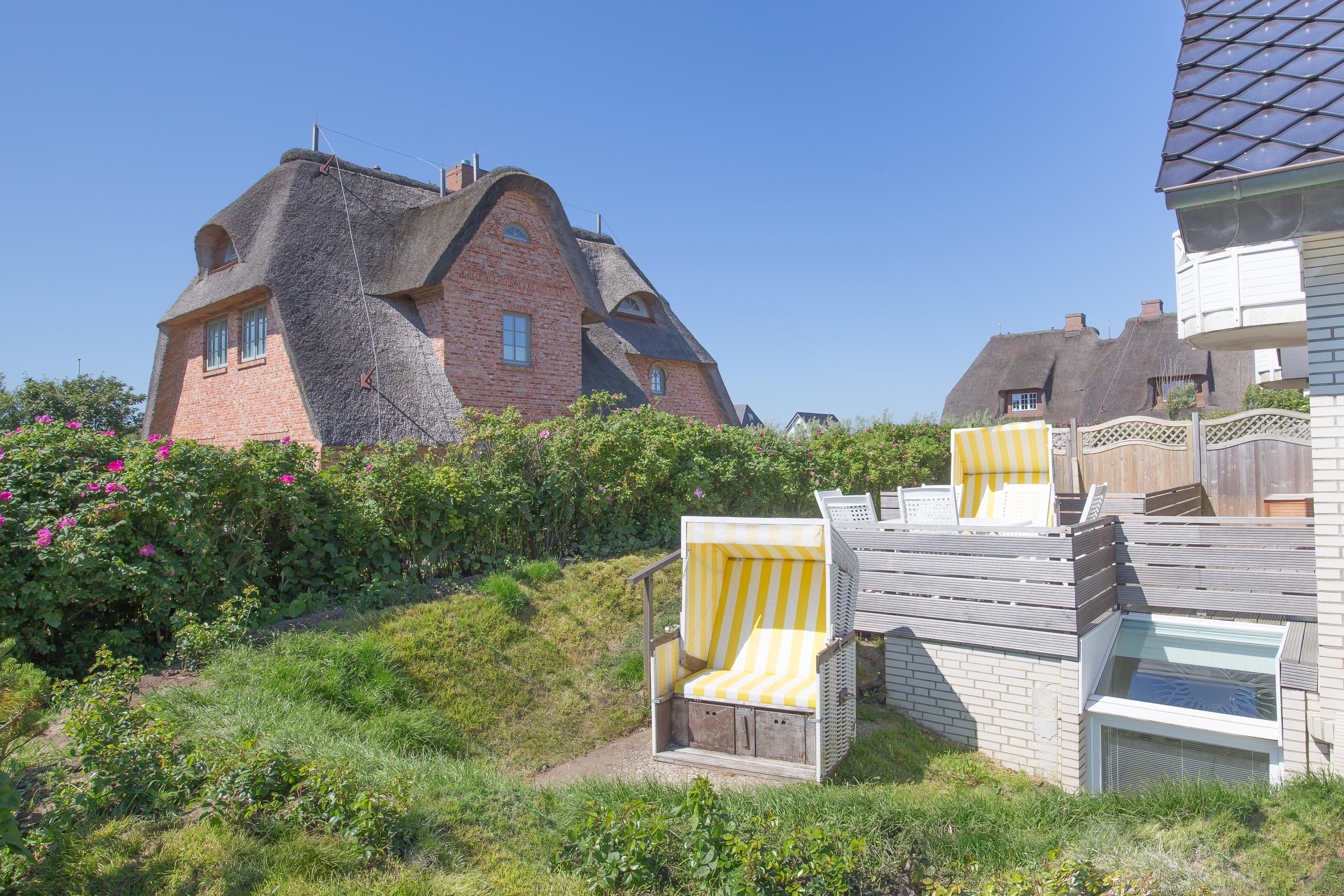 Sylter Luft können Sie auf einer großen Süd-Terrasse mit Strandkorb und Gartenmöbel oder in einer eigenen windgeschützten Gartenkuhle mit Strandkorb genießen.