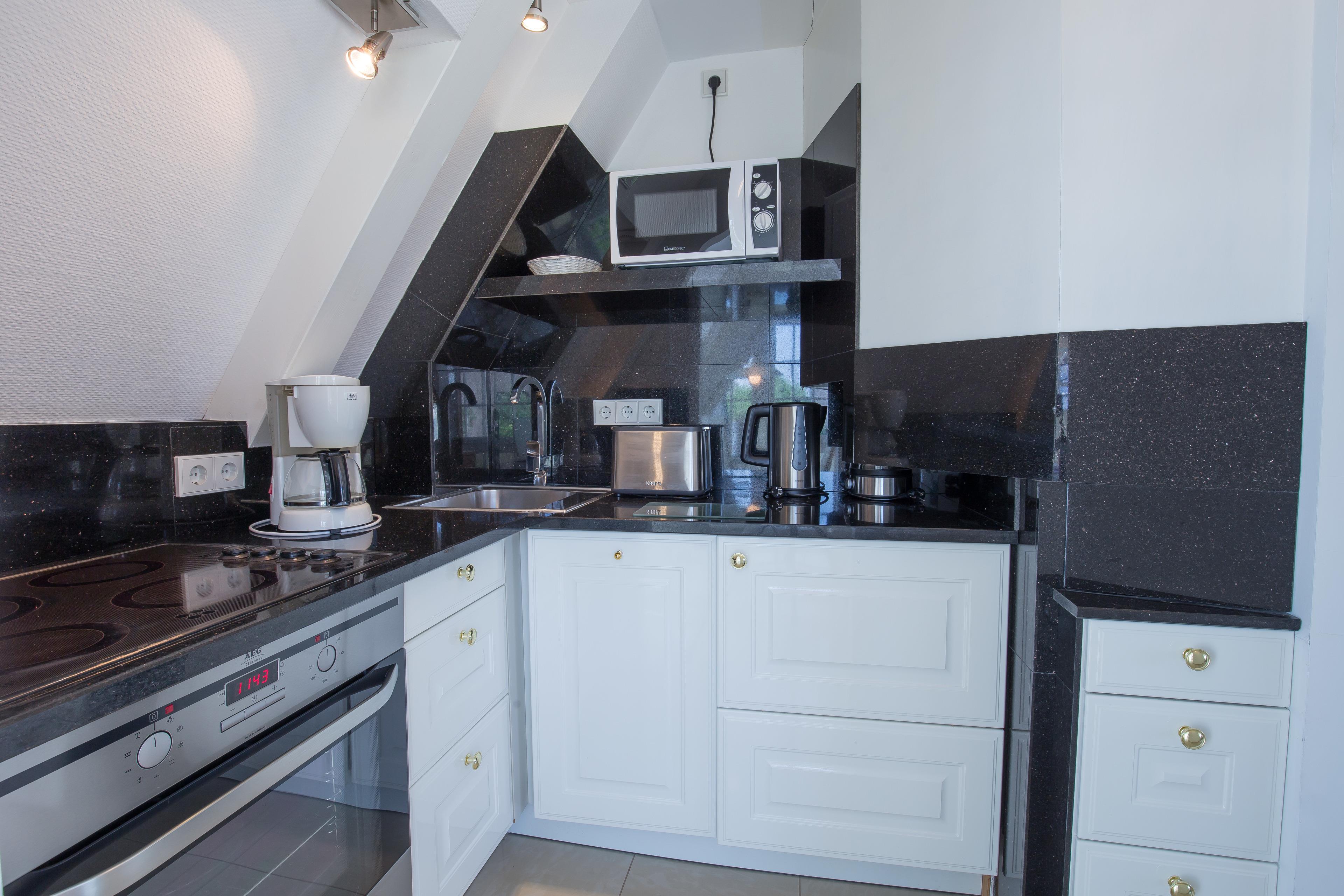 Die schicke Küche mit Backofen und Geschirrspüler ist komplett ausgestattet.