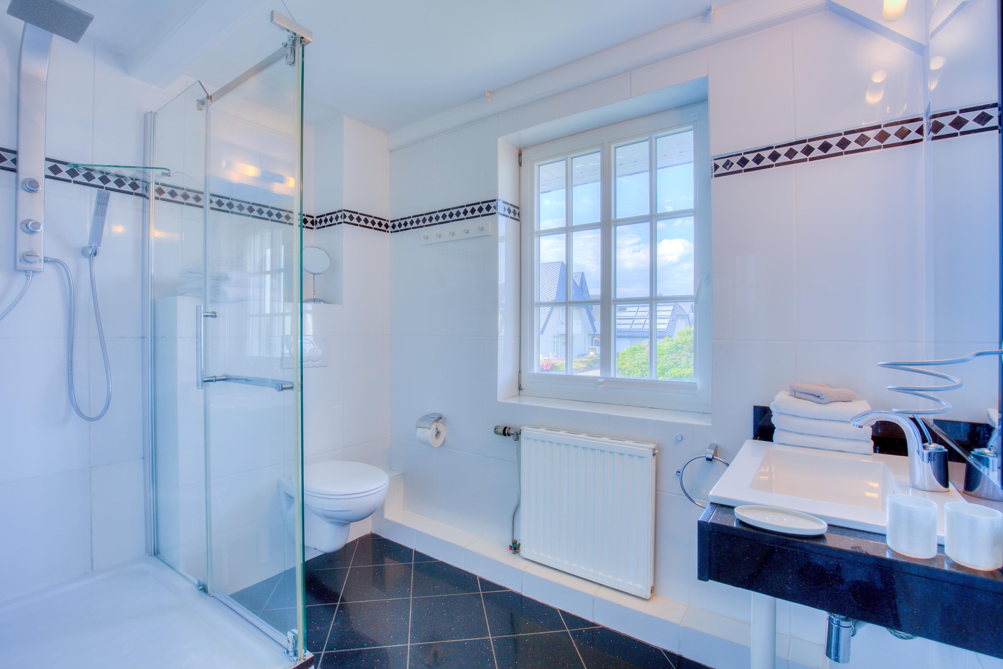 Richtig relaxen kann man im Wohlfühlbad mit Whirlpool oder im unteren großen Duschbad..