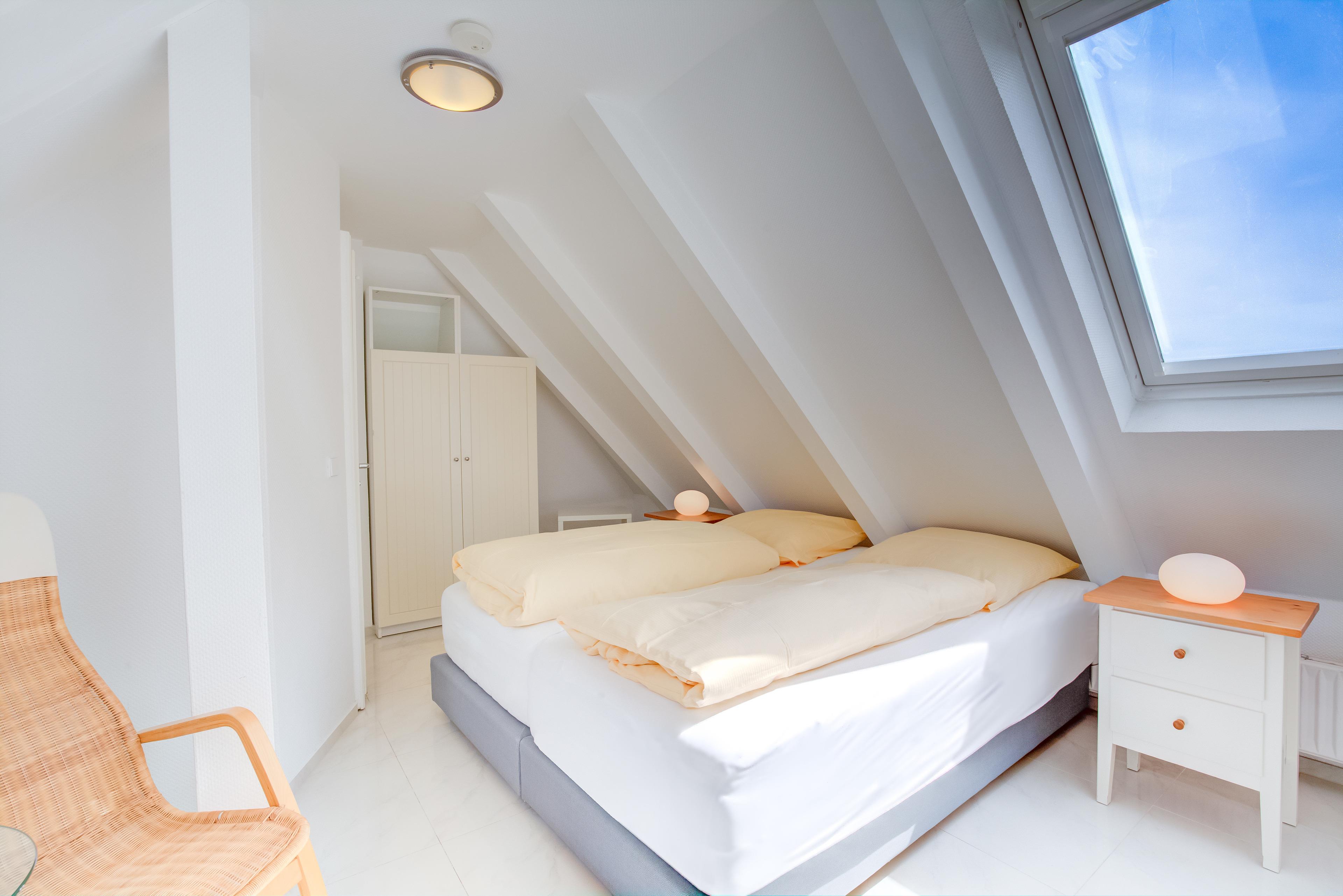Die Wohnung verfügt im Dachgeschoss über ein gemütliches Schlafzimmer mit Boxspringbett und Fernseher.