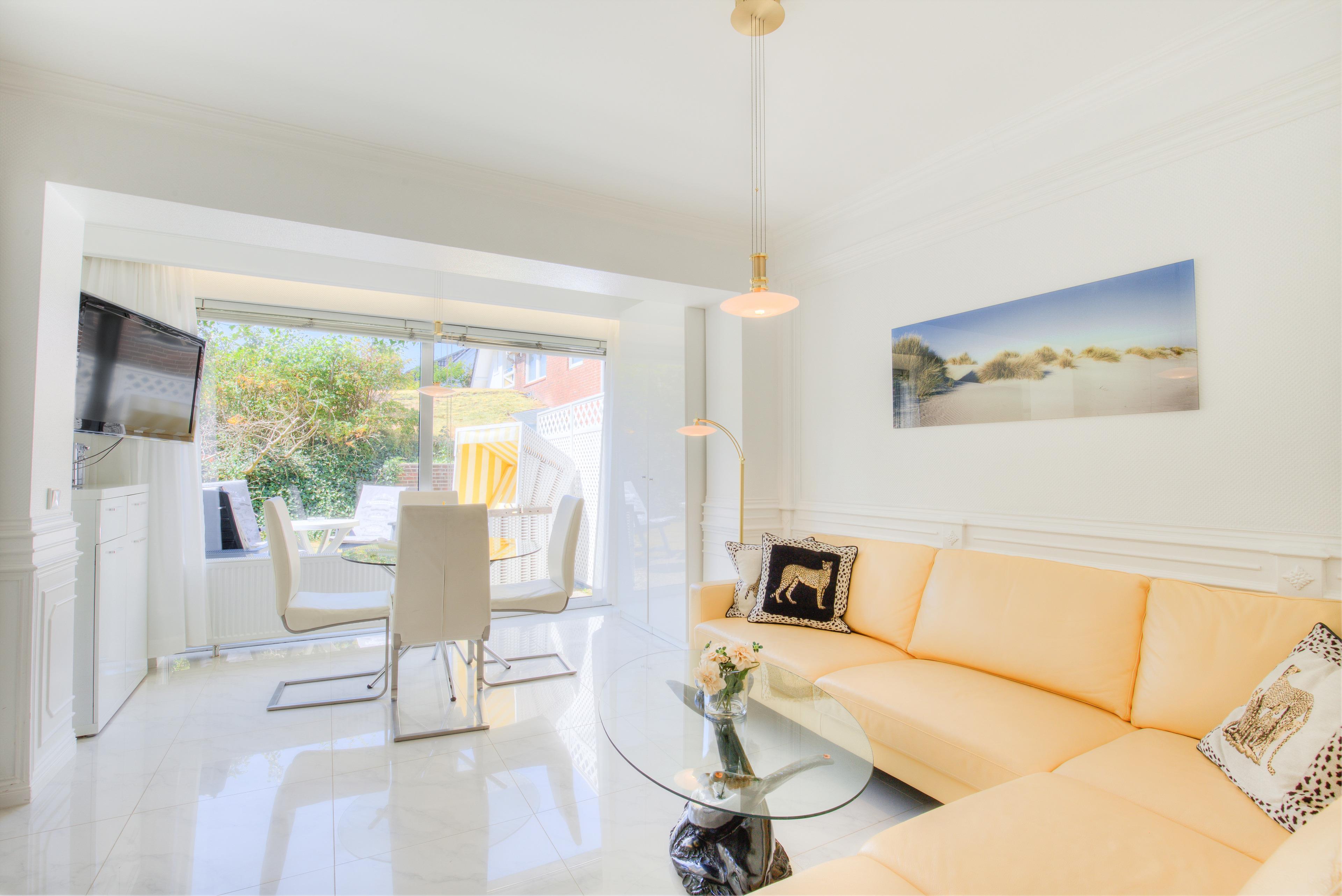 Erleben Sie einen komfortablen Sylt-Urlaub in dieser hellen, ca. 50 m² großen Ferienwohnung für 2 bis 3 Personen. Das lichtdurchflutete, schöne Wohnzimmer lädt mit hochwertigen Polstern und einem Essplatz mit Blick auf die Terrasse zum gemütlichen Verweilen ein.