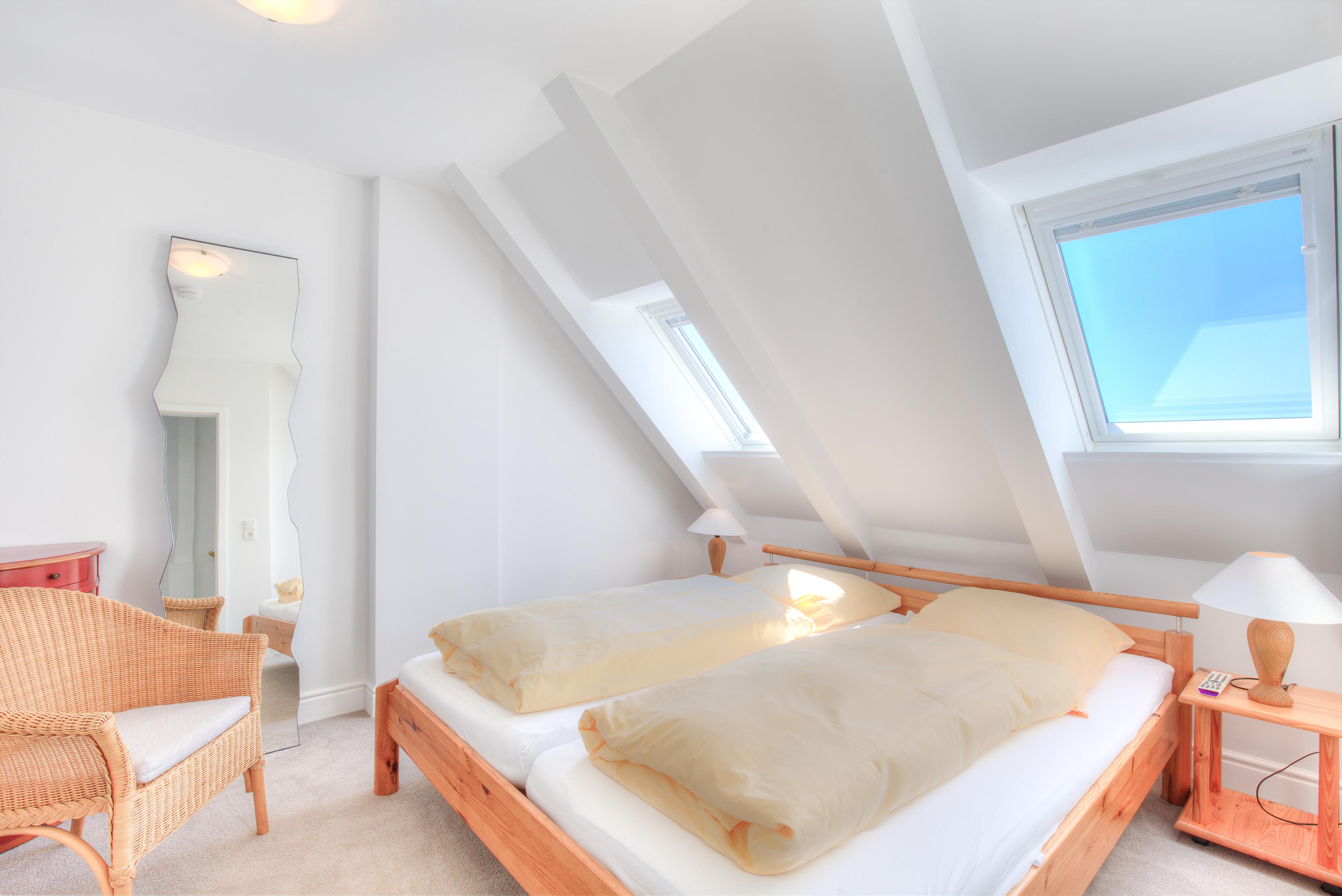 Über eine gut begehbare Treppe erreichen Sie das gemütliche Schlafzimmer unter Dachschrägen mit Doppelbett und Fernseher.