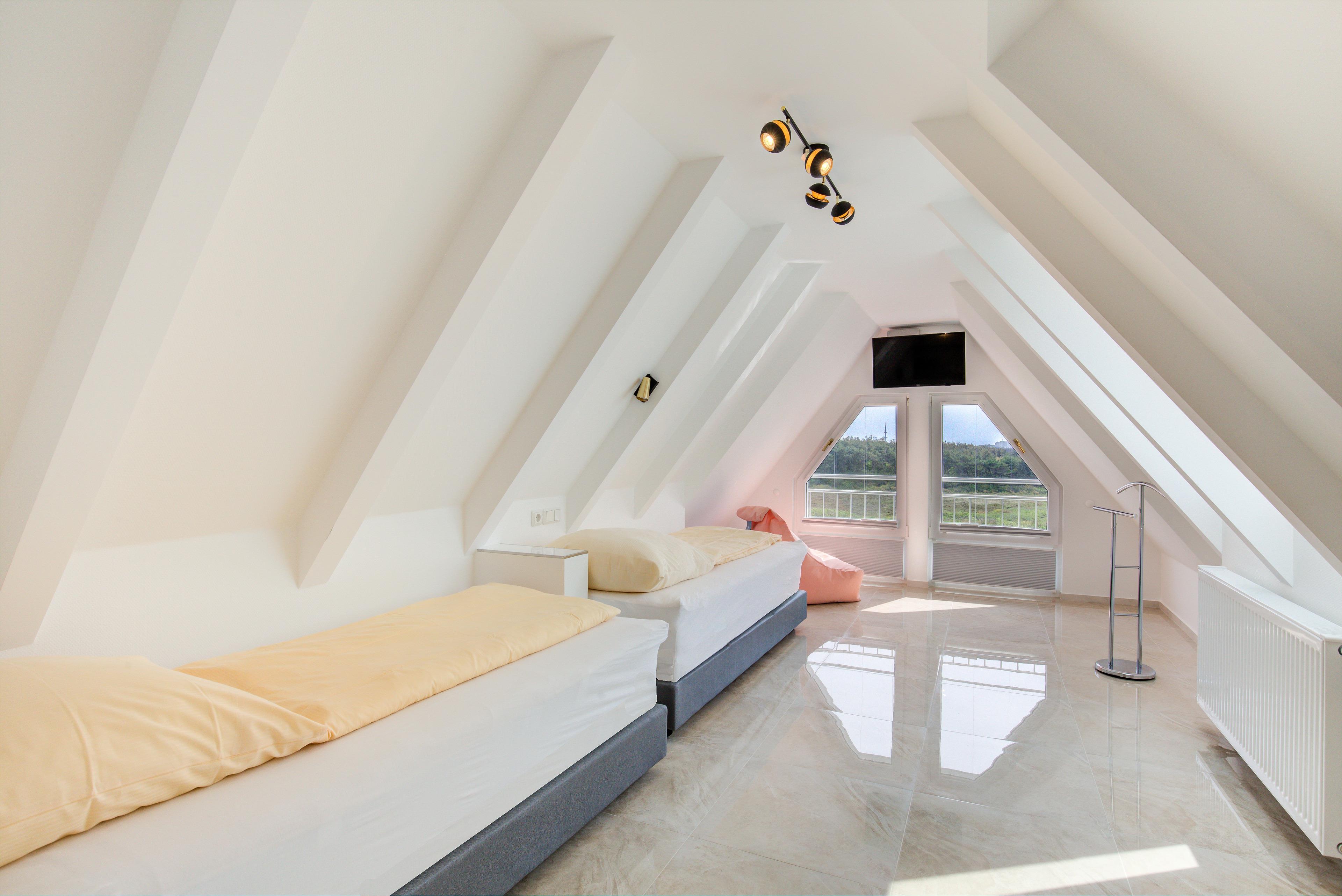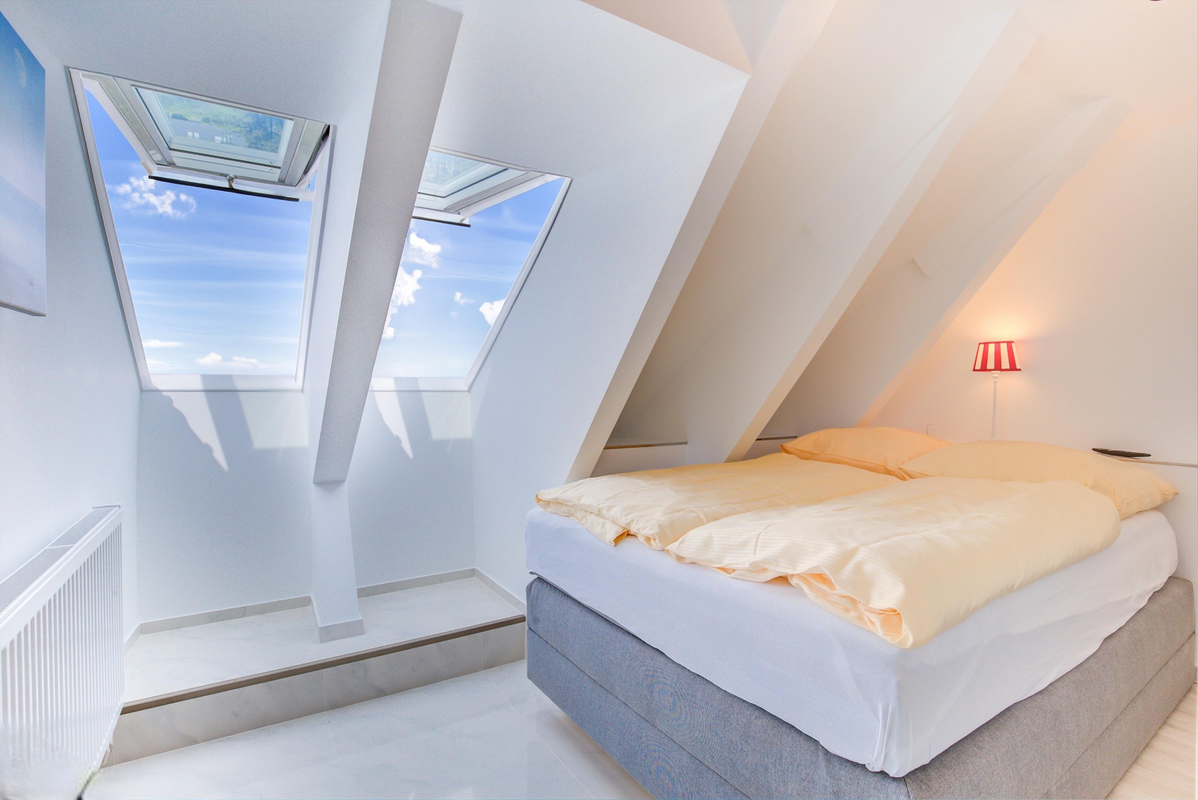 Einbauschränken für Ihre Urlaubsgarderobe sowie 2 Duschbäder befinden sich ebenfalls auf dieser Ebene. In dem darüber liegenden Dachgeschoss befinden sich zwei weitere Schlafzimmer mit einem tollen Ausblick über das Meer und die Heide.