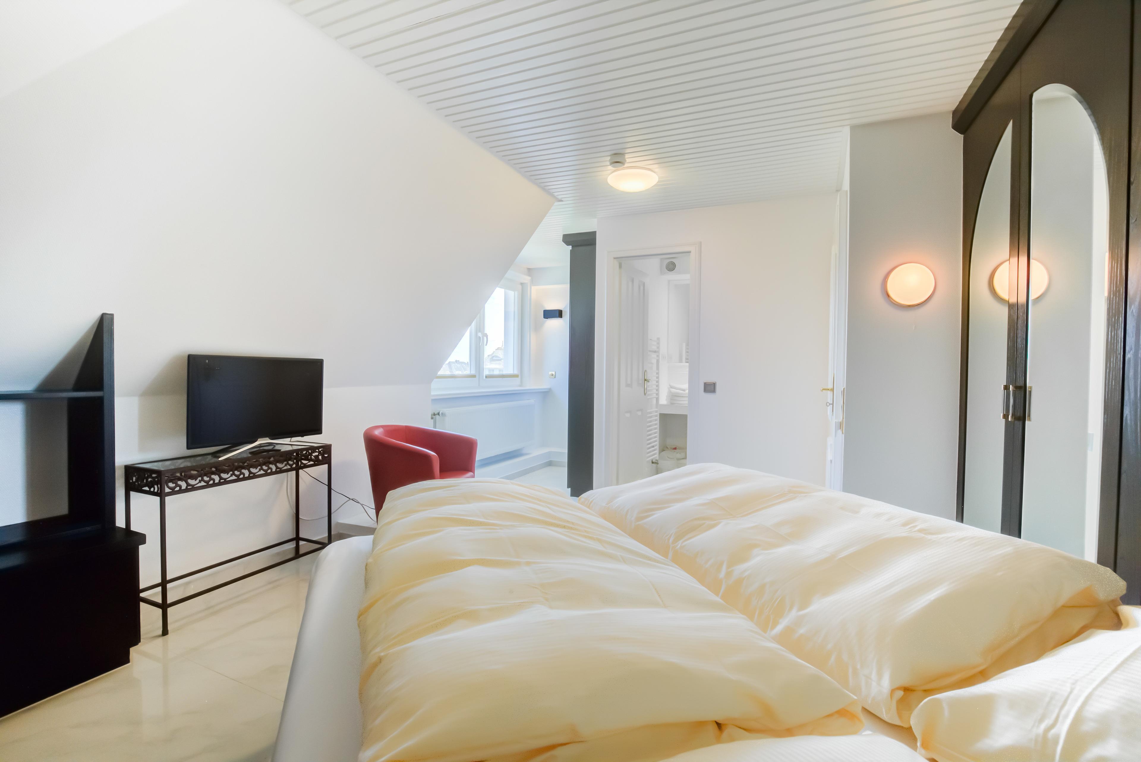 Jedem Schlafzimmer ist ein Duschbad zugeordnet. Dieser im Obergeschoss gelegenen Ferienwohnung ist auf der großen Gartenwiese eine eigene Terrasse mit Strandkorb und Gartenmöbeln zugeordnet