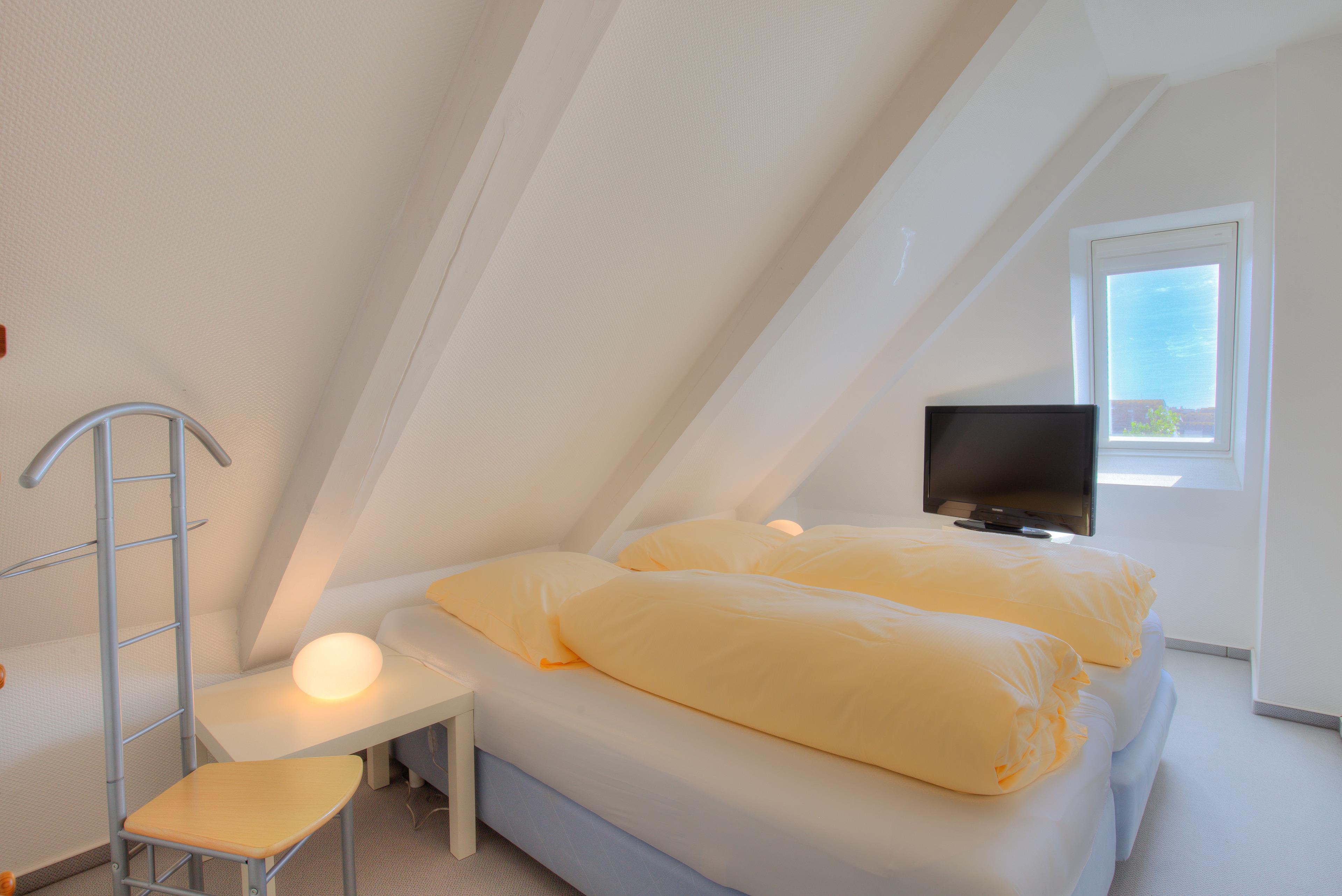 Im gemütlichen Schlafzimmer im Obergeschoss befinden sich ein Boxspringbett sowie ein weiterer Fernseher