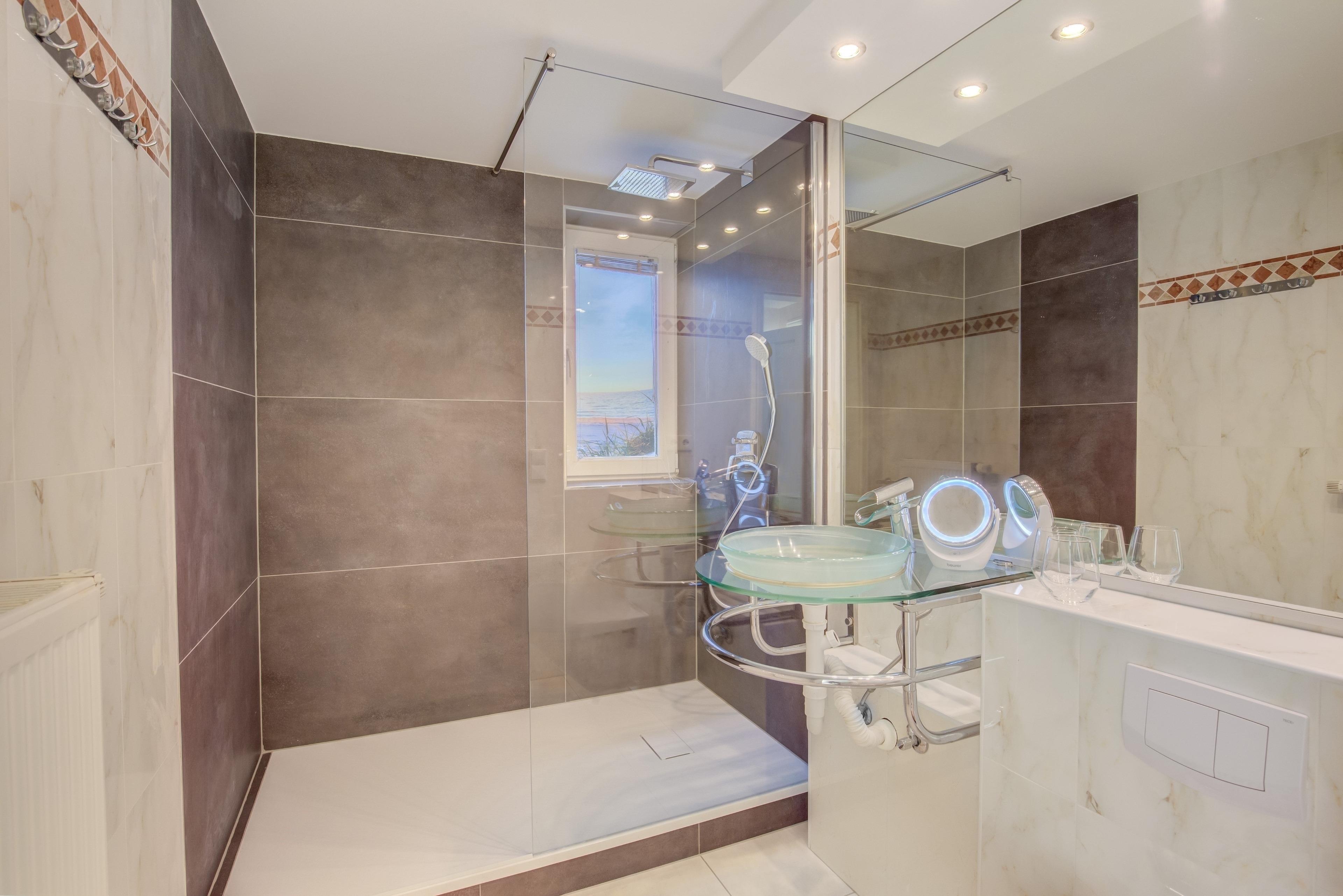Im Untergeschoss erwarten Sie drei Schlafzimmer mit Doppelbetten und Fernseher sowie ein großes Bad mit Whirlpool. Das zweite Bad mit Dusche ist ebenfalls hier.