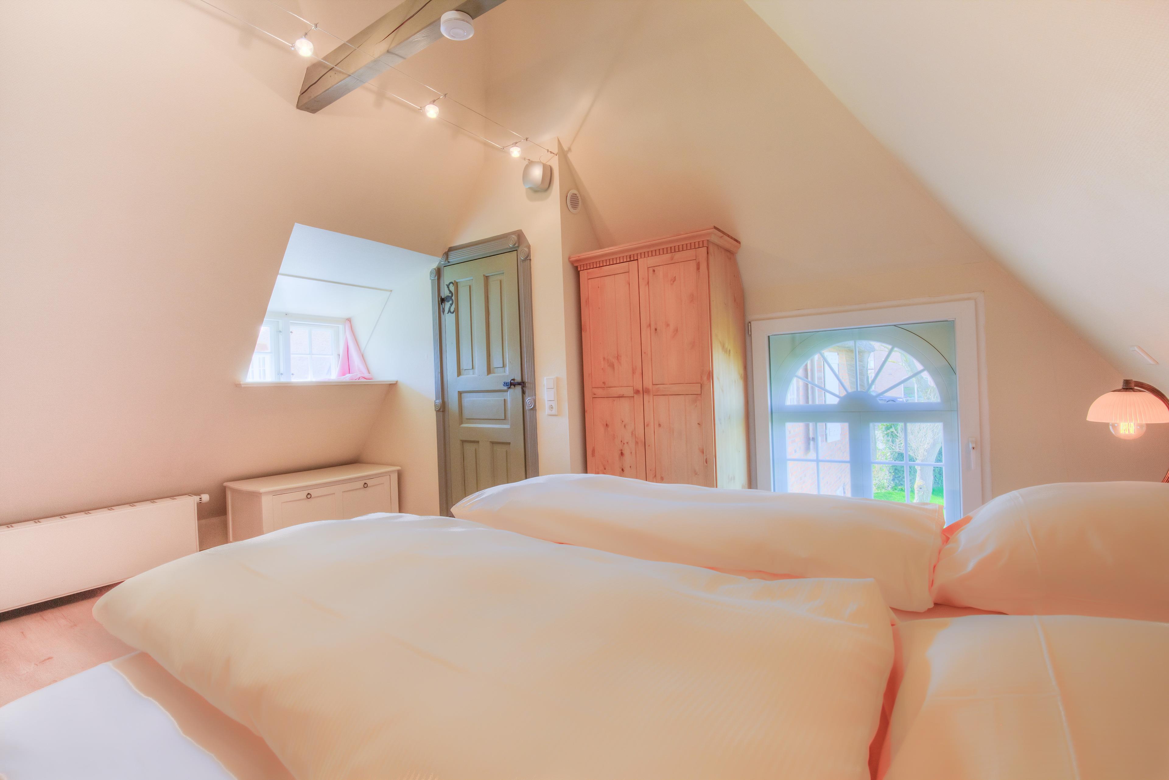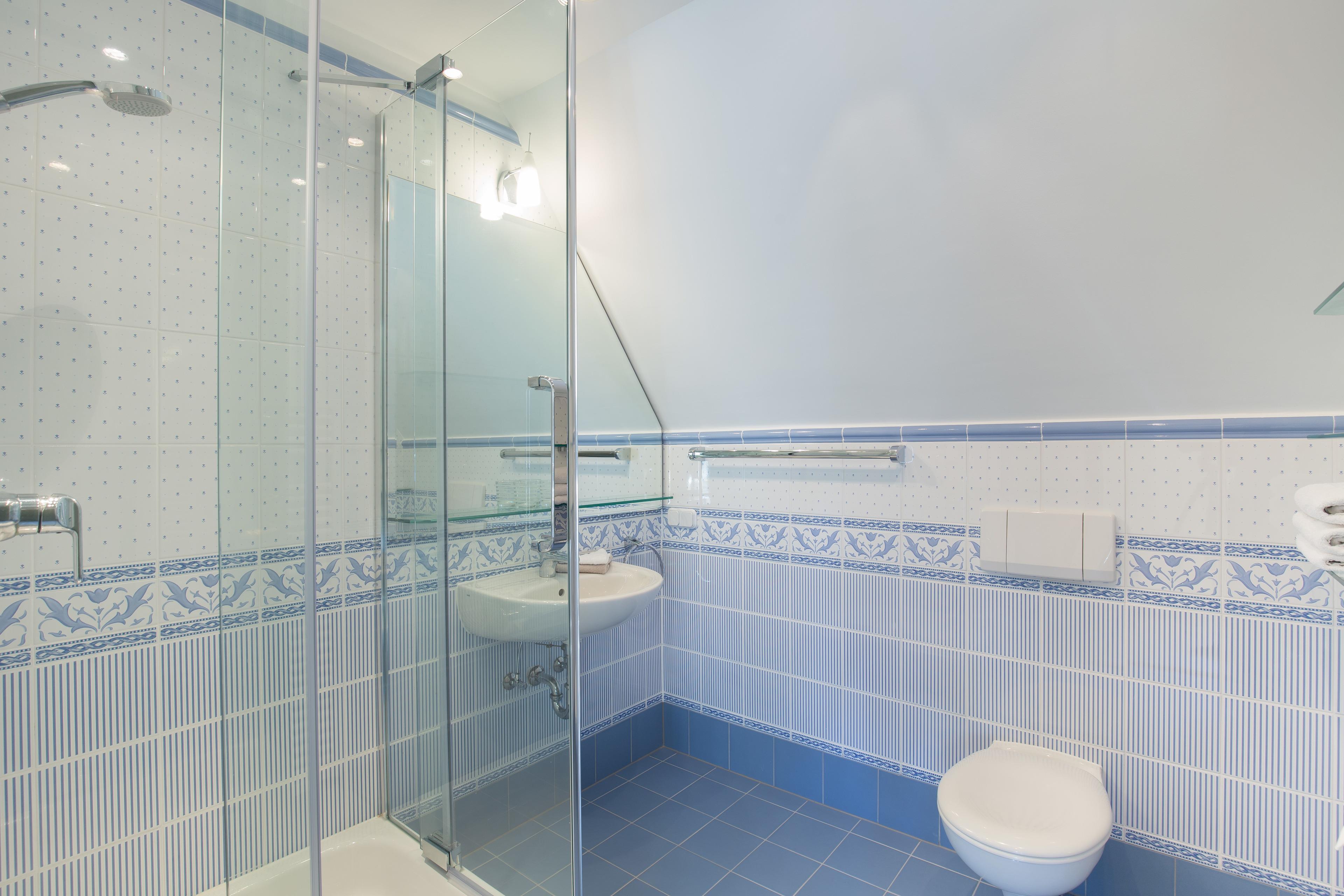 Ebenfalls im Erdgeschoss befindlich sind das große behindertengerechte Duschbad und das behagliche Doppelschlafzimmer mit Blick auf den ruhigen Terrassenbereich. Über die gut begehbare Treppe erreichen Sie zwei weitere Schlafzimmer mit jeweils eigenem Duschbad.
