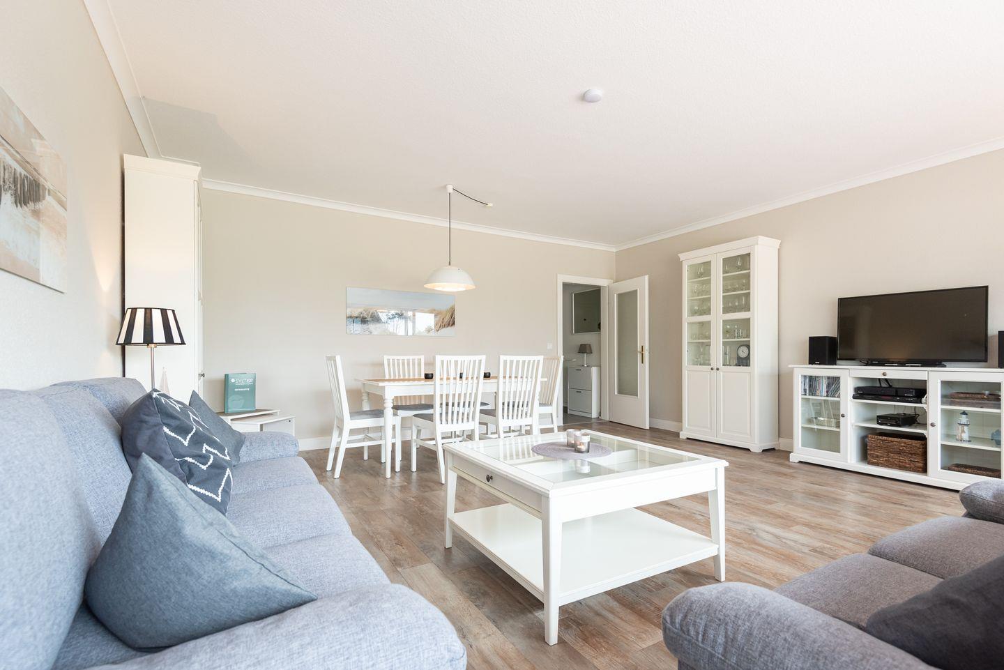 Wohn- und Essbereich: Der geräumige Wohnbereich mit Essecke, gemütlicher Sitzgarnitur und TV laden zum langen Verweilen ein. Freuen Sie sich auf die angrenzende große Terrasse, sowie den herrlichen Garten nach Süd-Westen, der mit schönen Gartenmöbeln und einem Strandkorb ausgestattet wurde.