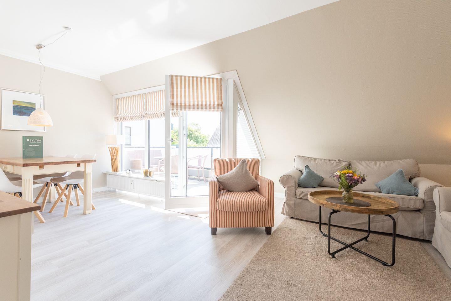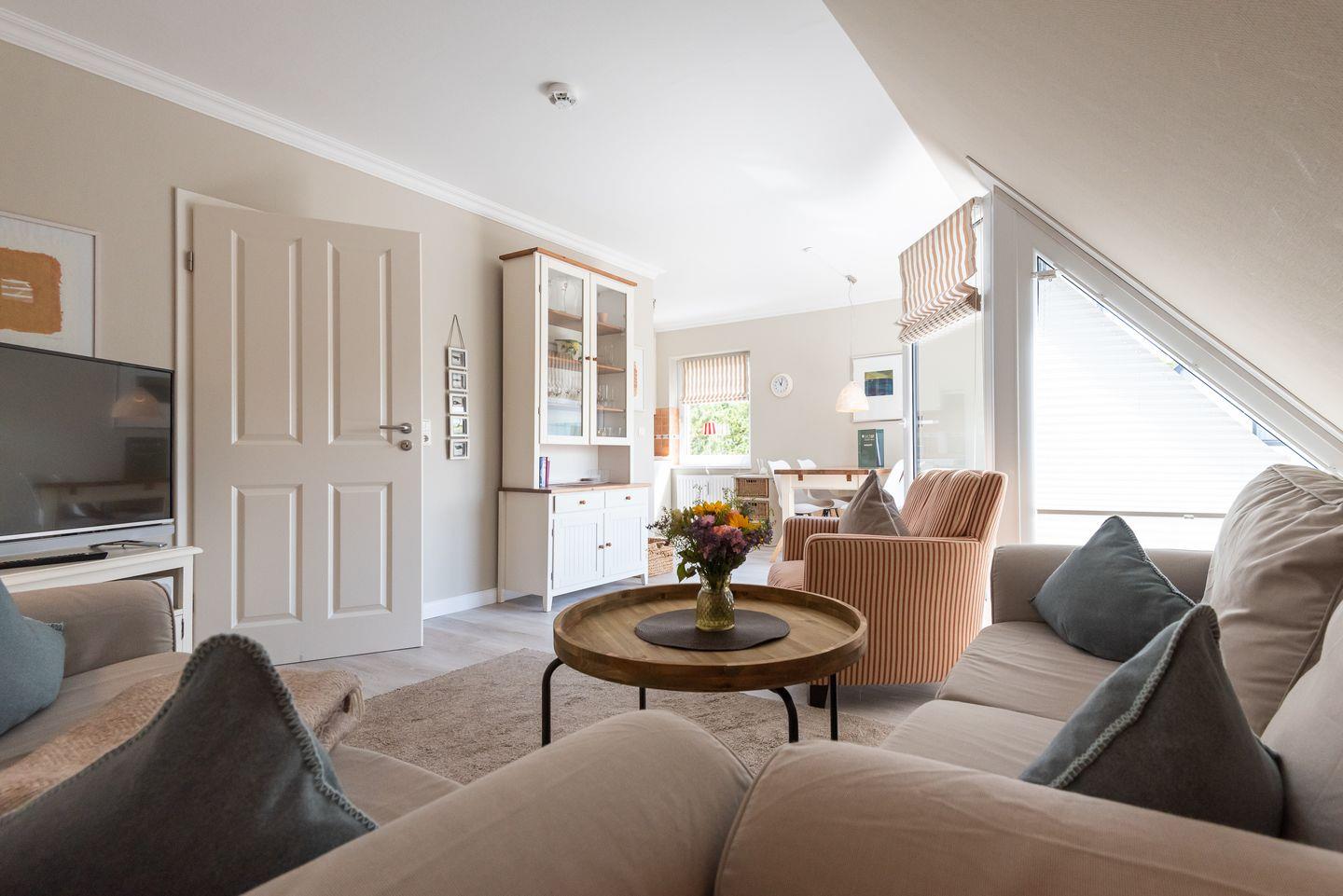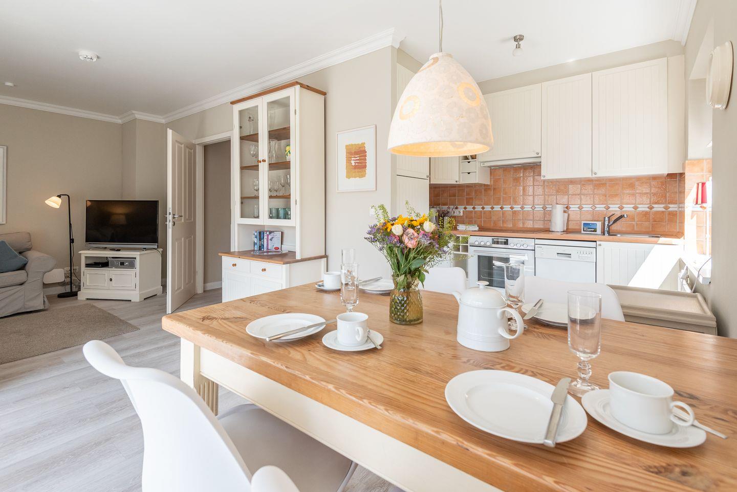 Wohn-/Koch-/Essbereich: Die helle Landhausküche erfüllt alle Ansprüche. Der gemütliche Essbereich lädt zum Verweilen ein. Im Wohnzimmer finden Sie eine bequeme Sitzgruppe und einen großen TV. Von hier geht es auf den Südbalkon mit schönen Gartenmöbeln.