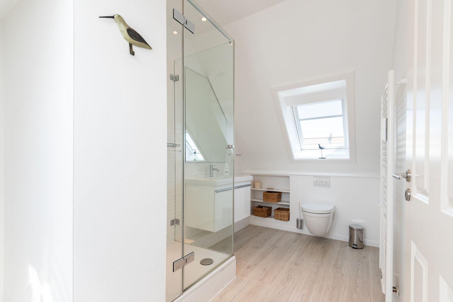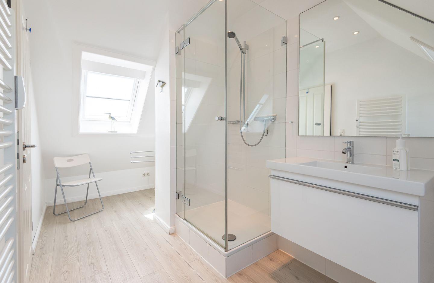 Badezimmer 1: Geräumiges, modernes Badezimmer mit Dusche, WC und Fenster.