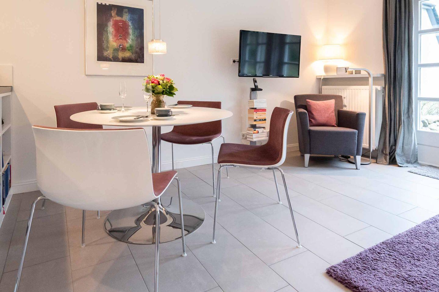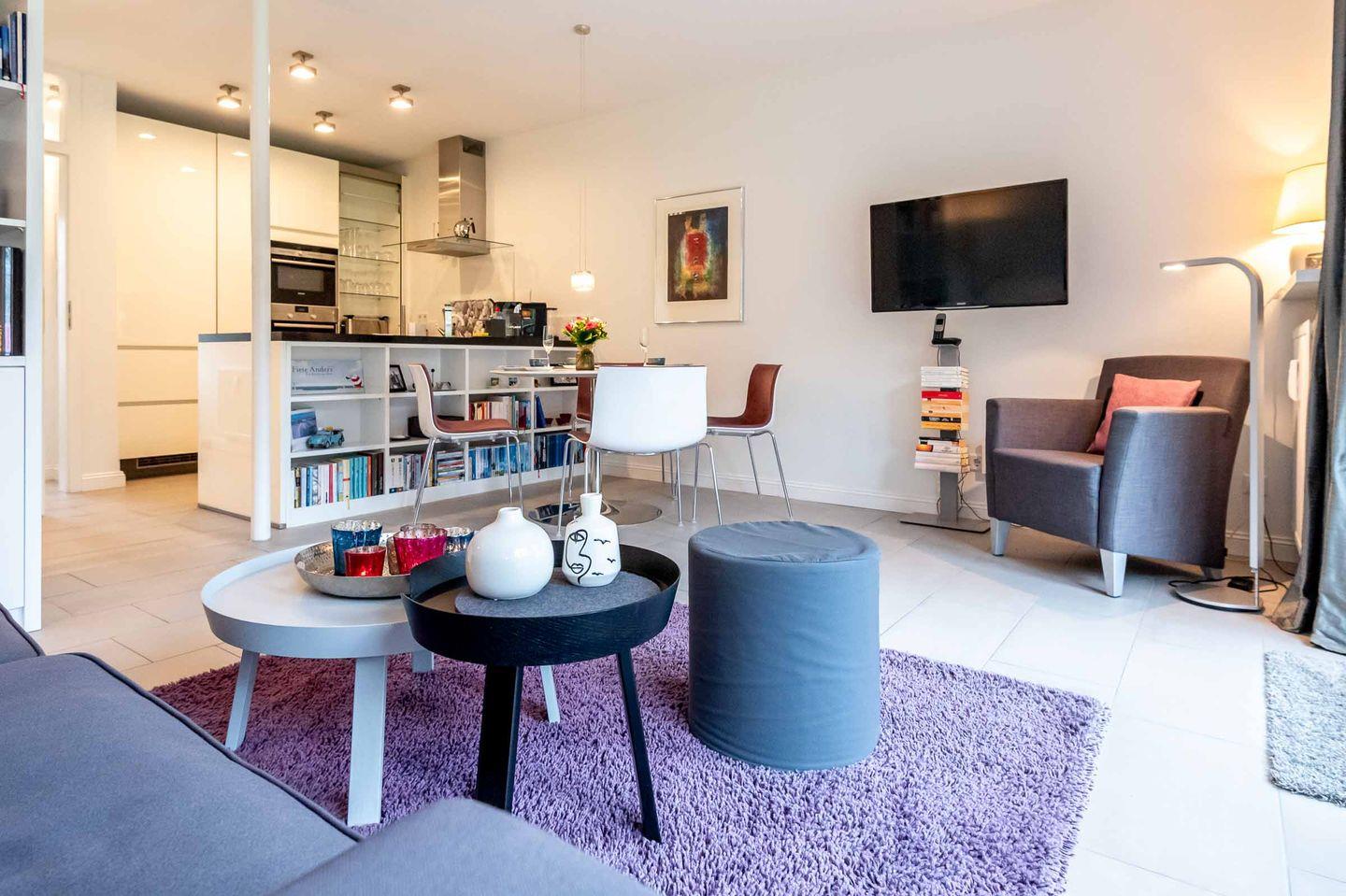 Wohn-/Koch-/Essbereich: Offene, moderne Küche, perfekt ausgestattet bis ins Detail, sowie eine bequeme Essgruppe. Der gemütliche Loungebereich mit Flachbildschirm und Lese-Sessel, lädt zum Entspannen ein. Von hier betreten Sie auch die nach Südwesten gelegene Terrasse mit edlem Gartenmobiliar und einem Saison-Strandkorb.