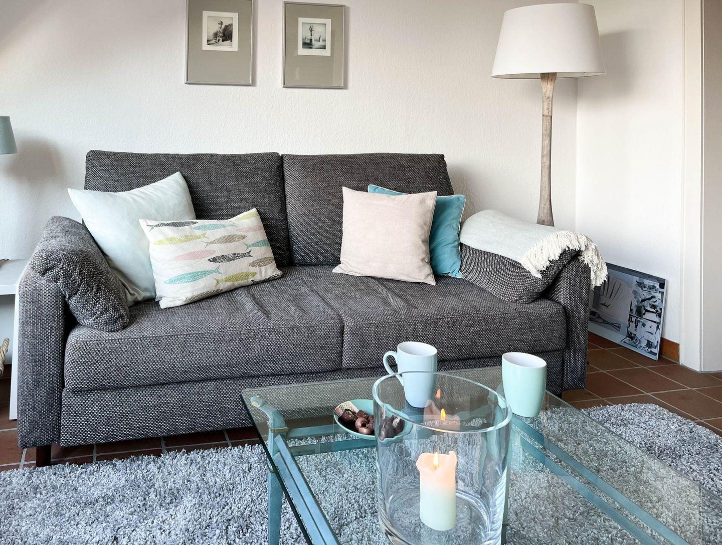 Koch-/Wohn-/Essbereich: Zur Sonnenseite ausgerichtet liegt der helle Wohnraum mit einem gemütlichem Schlafsofa, modernem TV sowie der geschickt integrierten Küche. Sie genießen Ihr Frühstück am Esstisch oder auf dem möblierten Süd-West-Balkon mit Blick in den Garten.