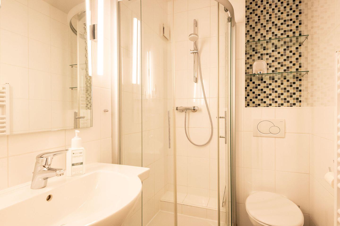 Badezimmer: Modernes Duschbad mit WC und Handtuchtrockner.