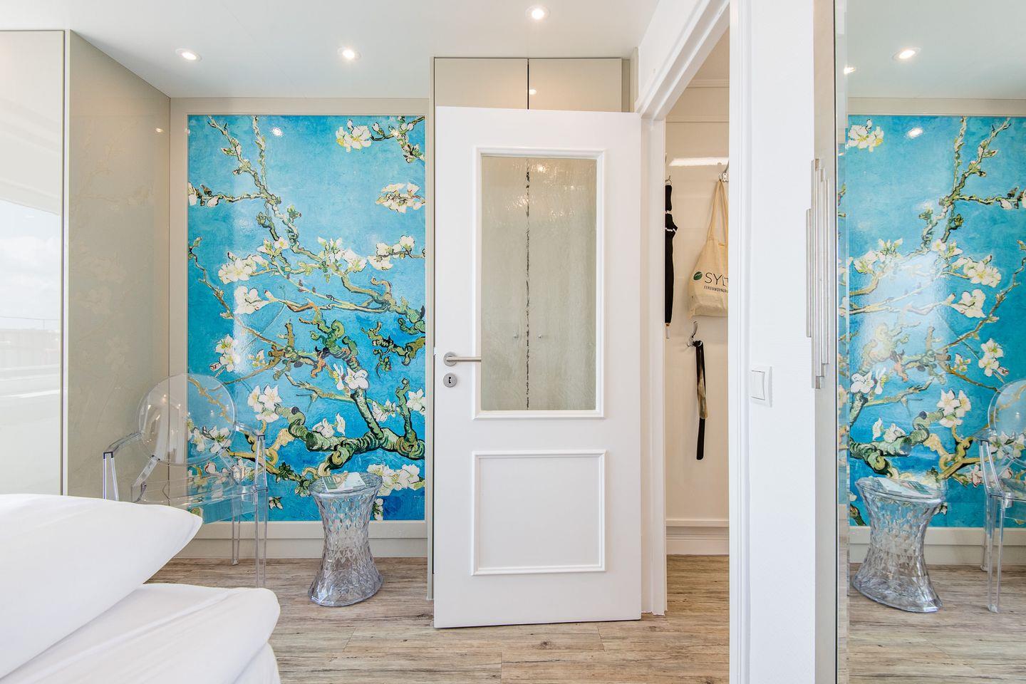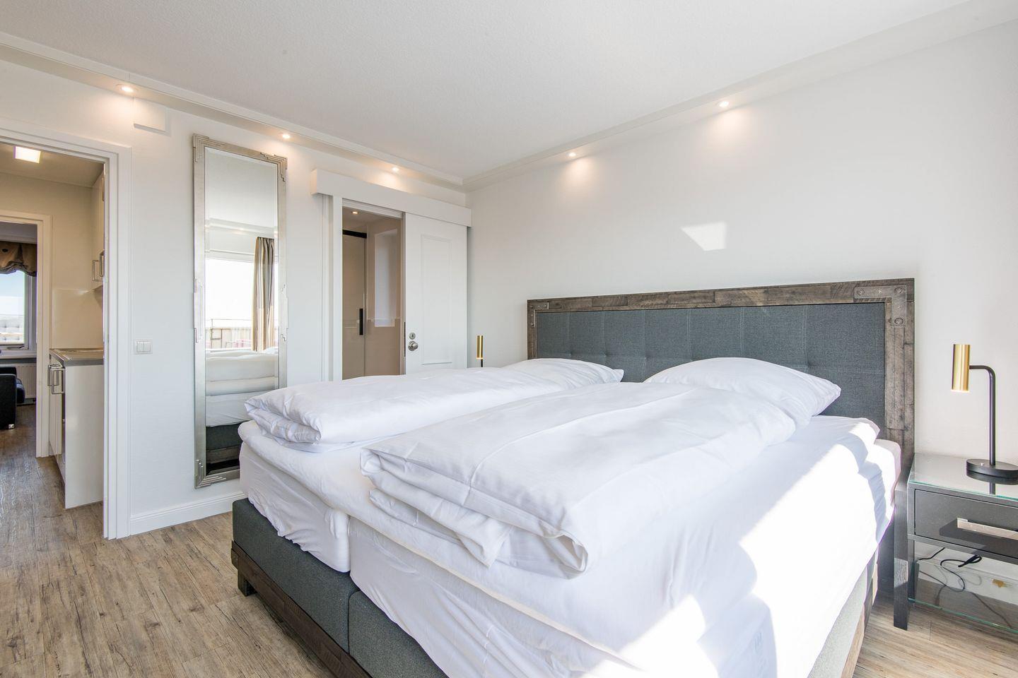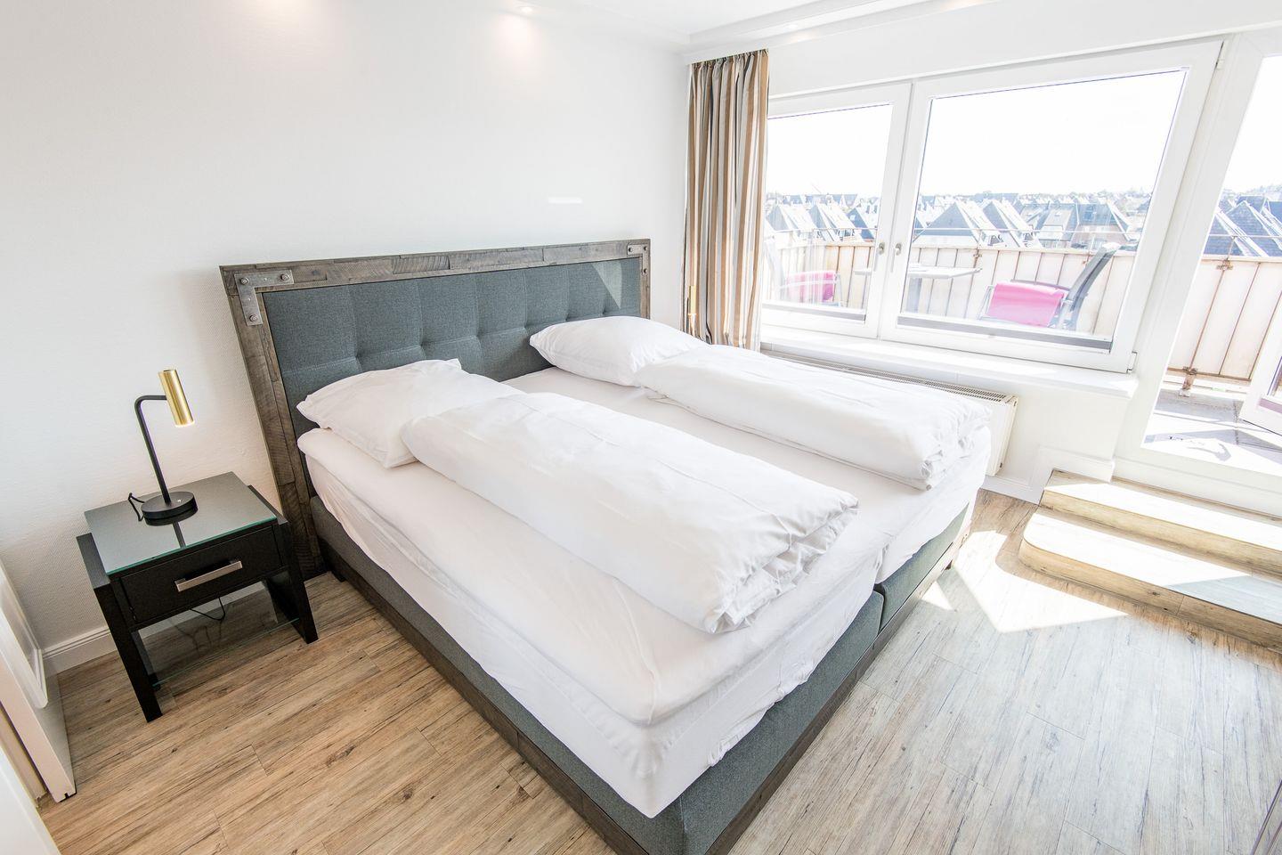 Schlafzimmer: komfortables Boxspringbett (2m x 2m), Fensterfront und Balkon Richtung Osten (Morgensonne), der einen Weitblick in Richtung Dorfteich und Kampen ermöglicht.