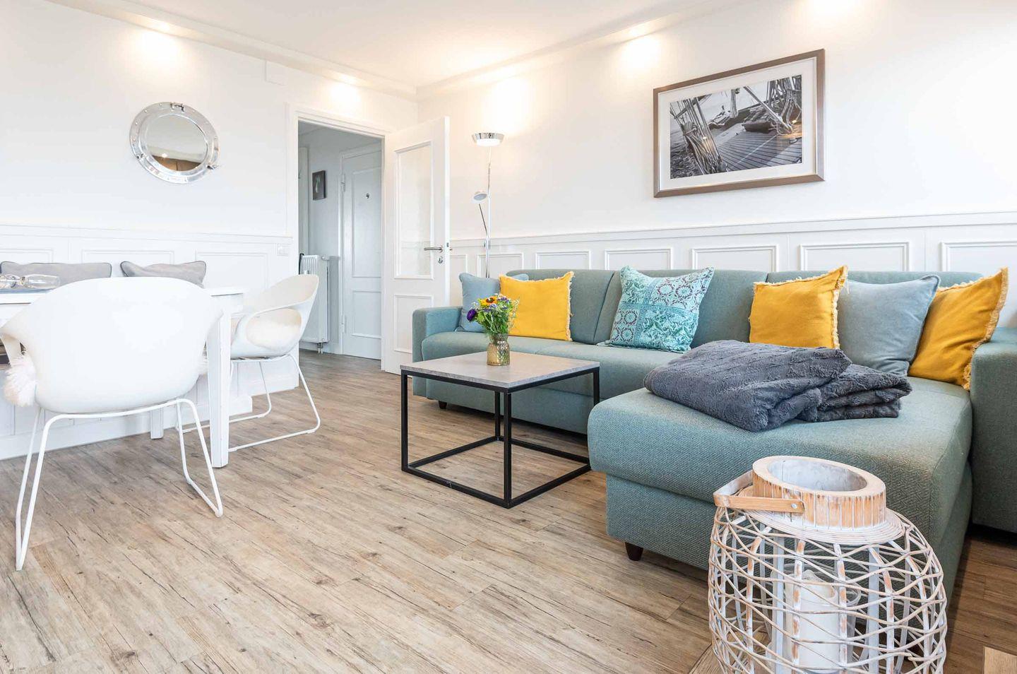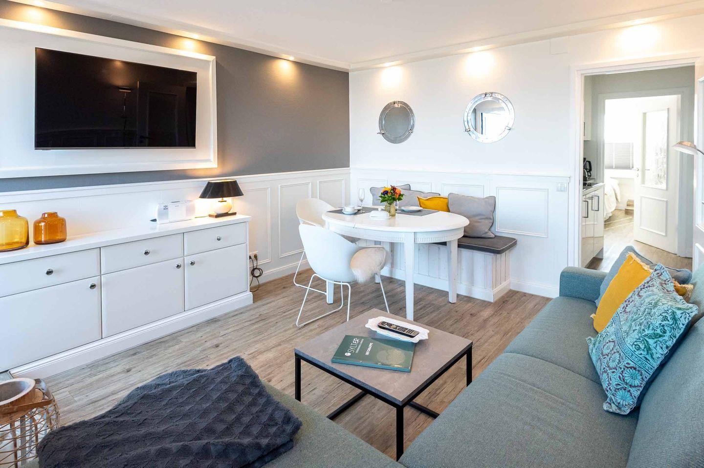Wohn-/Essbereich: Wohn- und Essbereich mit traumhaftem Ausblick auf die Nordsee. Die moderne Einrichtung und der große TV sorgen für höchsten Wohnkomfort. Von Ihrer großzügigen Dachterrasse können Sie jeden Tag das Meeresrauschen genießen.
