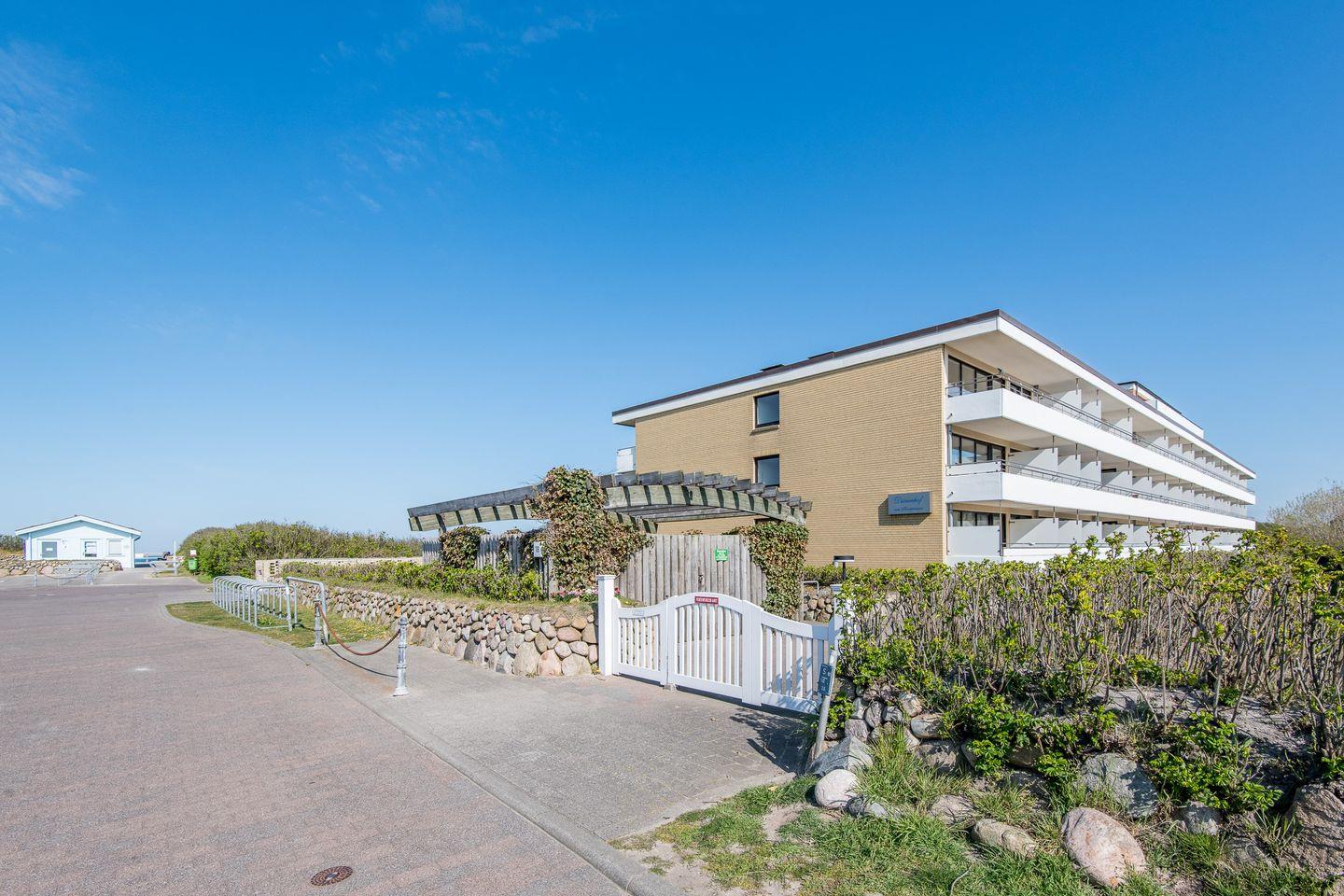 Lage: Umrahmt wird das Wohngebäude an der Westseite von der Naturlandschaft mit Dünengras und Heckenrosen. Fußläufig oder mit dem Fahrrad erreichen Sie in wenigen Minuten die Promenade u.a. mit dem Kurmittelhaus, Einkaufsmöglichkeiten und vielen Restaurants.