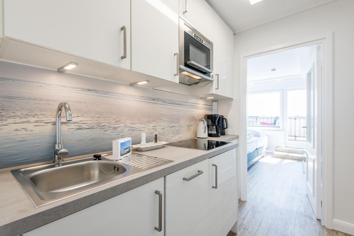 Küche: Moderne, gut ausgestattete Pantryküche mit Mikrowelle, Spülmaschine und Ceran Herd.