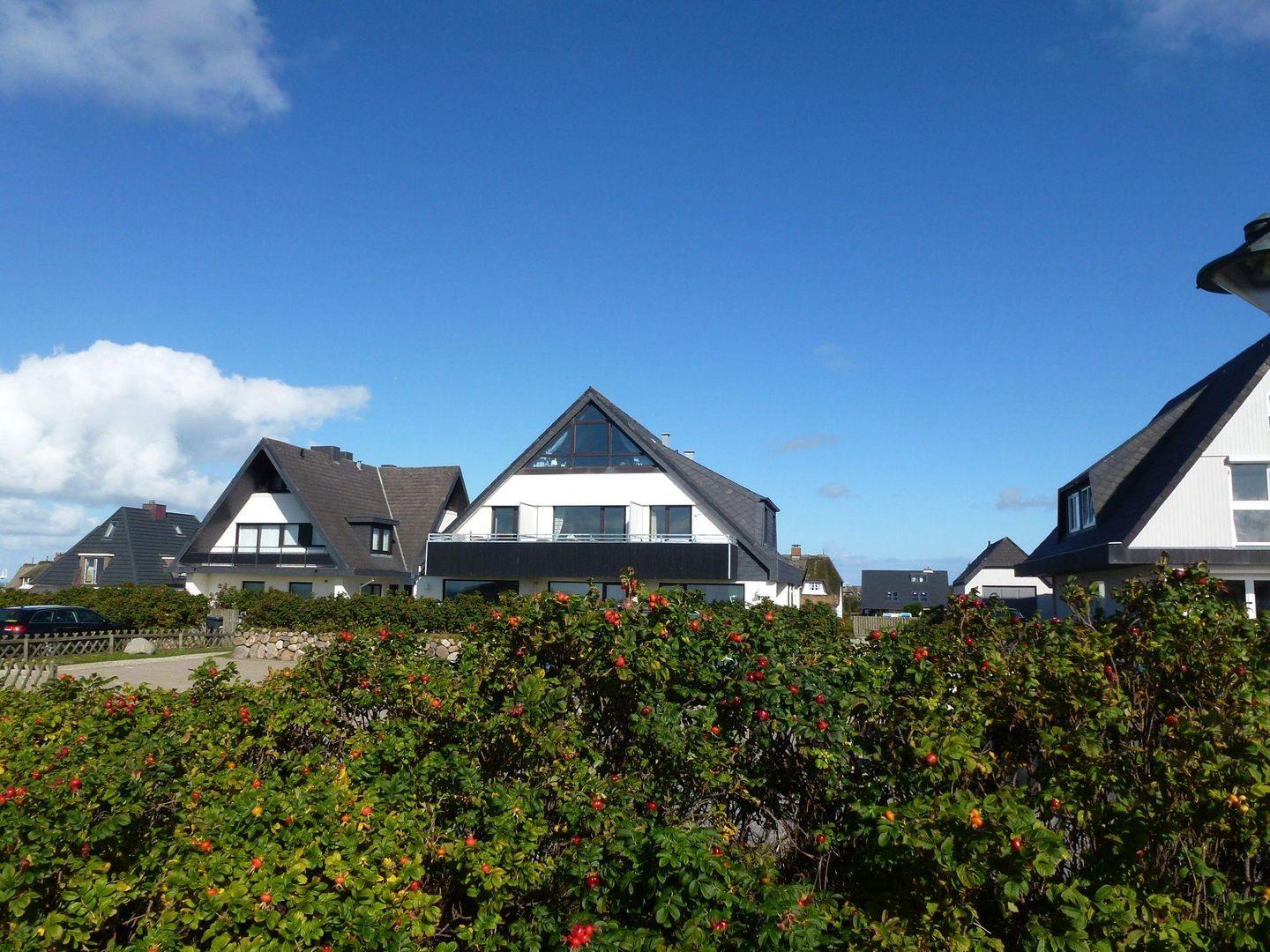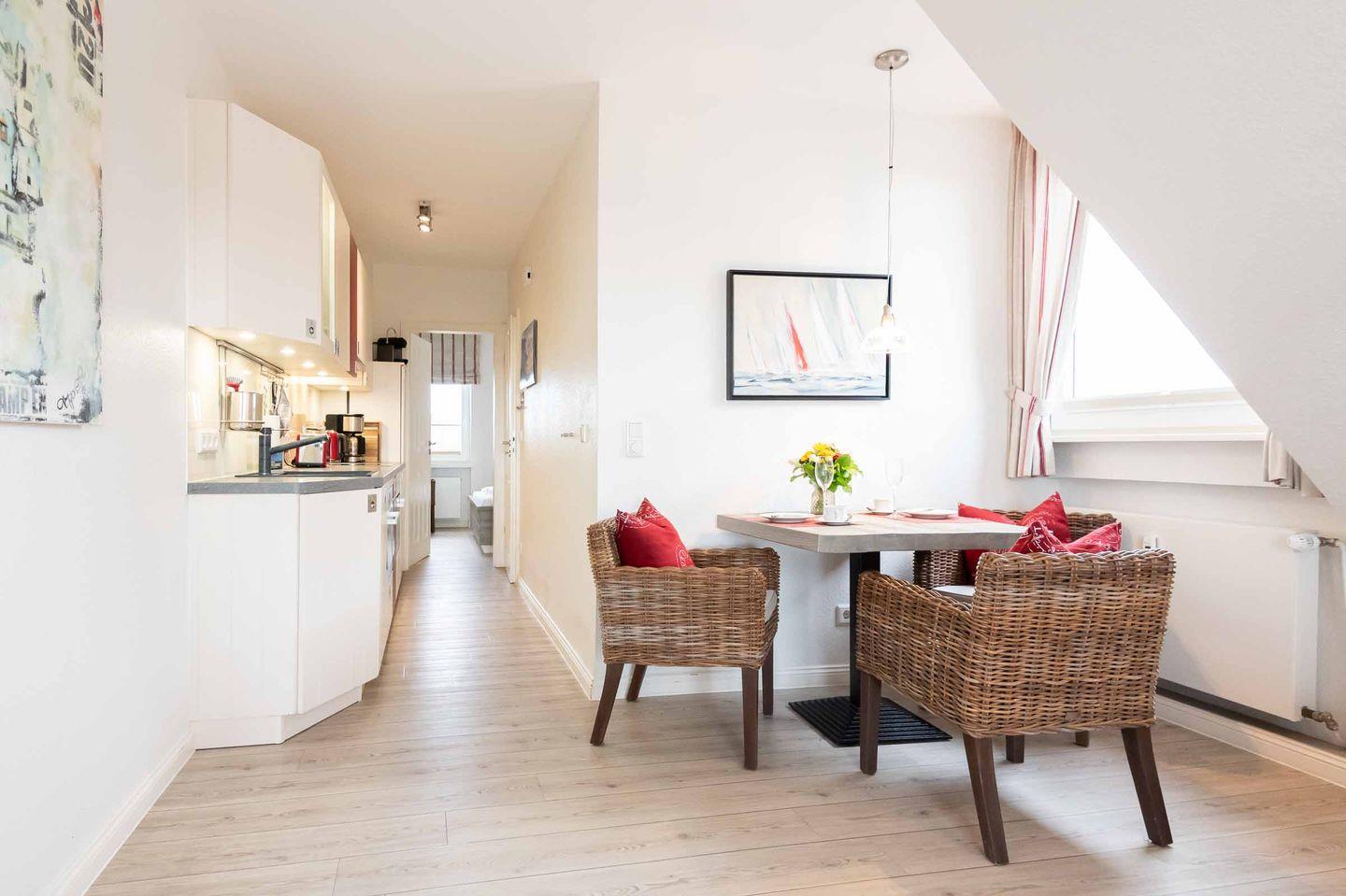 Wohn-/Koch-/Essbereich: Behaglicher, lichtdurchfluteter Wohnbereich mit TV und Kuschelsofa. Die Essecke befindet sich unter einem der vielen Fenster in der hellen Wohnung. Die edle Küchenzeile wurde geschickt im Flurbereich eingebaut. Von hier aus können Sie auch den geräumigen Südbalkon mit einmaligen Meer- und Heideblick genießen.