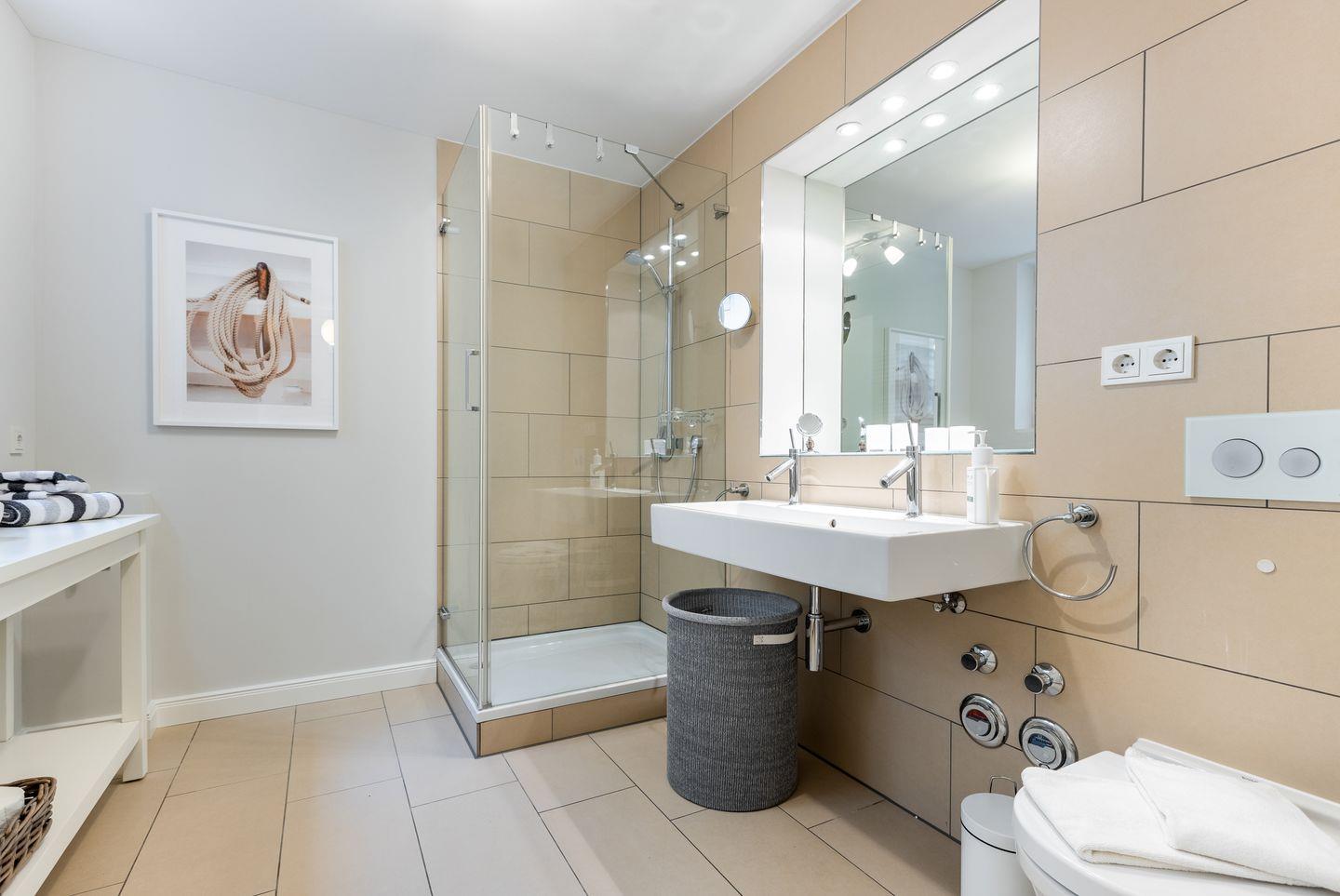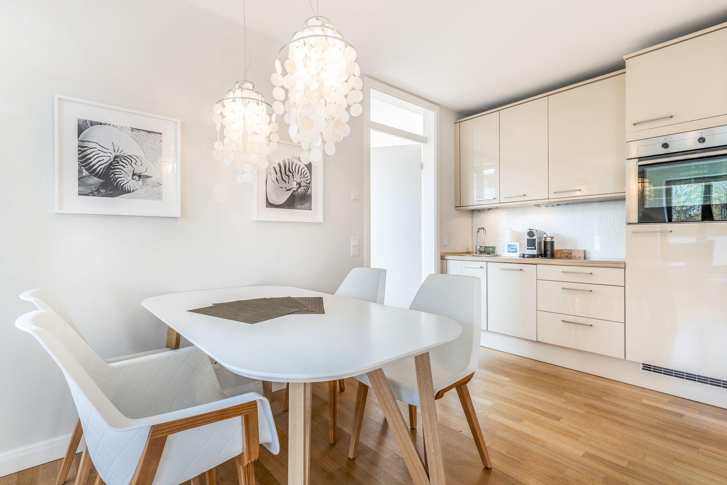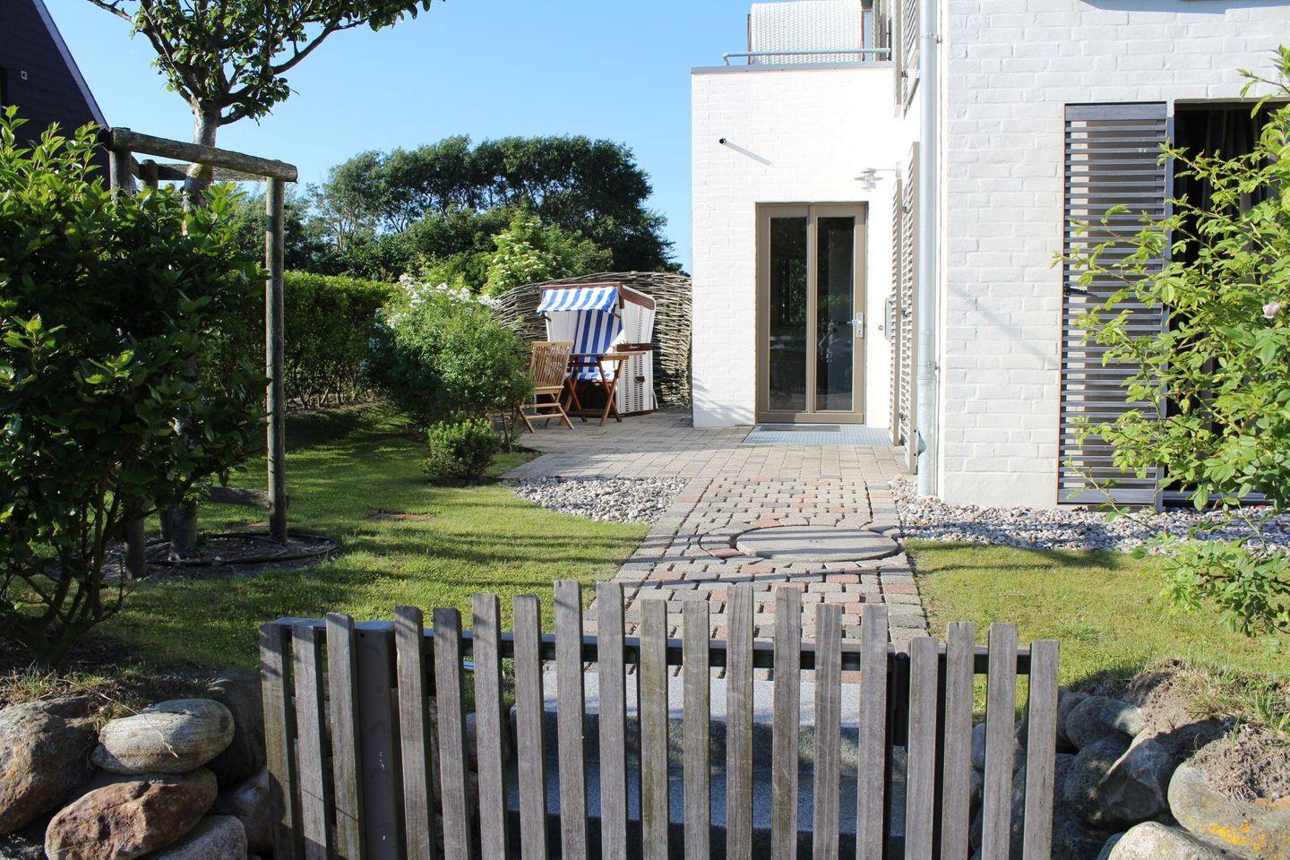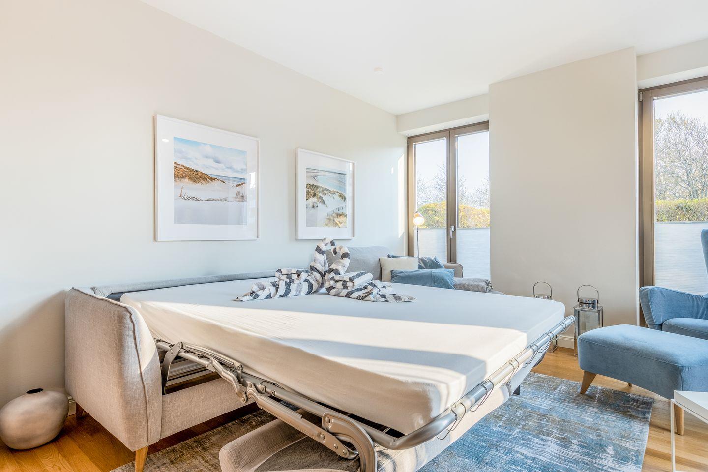 Koch-/Wohn-/Essbereich: Großer Wohnraum mit Sofa im Loungestil, welches sich schnell in einen hochwertige Schlafplatz verwandeln lässt. Der TV und eine kleine Hifi-Anlage lassen keine Wünsche offen. Integrierte, edle Küchenzeile mit Backofen und Geschirrspüler, sowie großem Essplatz. Auf der Süd-Westterrasse mit kleinem Garten stehen Gartenmöbel und ein Saison-Strandkorb bereit.