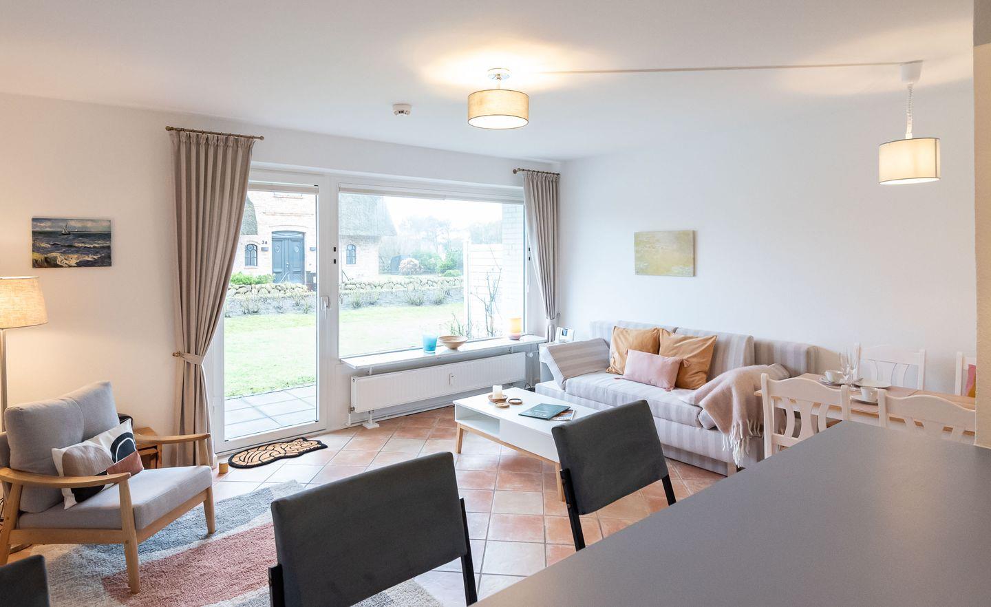 Koch-/Ess-/Wohnbereich: Neu renovierter Wohnbereich mit TV und separater Essecke. Die helle Pantryküche ist mit einer gemütlichen Bar ausgestattet. Das Schlafsofa bietet Platz für zwei Personen. Nach Süden ausgerichtete Sonnenterrasse mit einem Strandkorb und Gartenmöbeln.