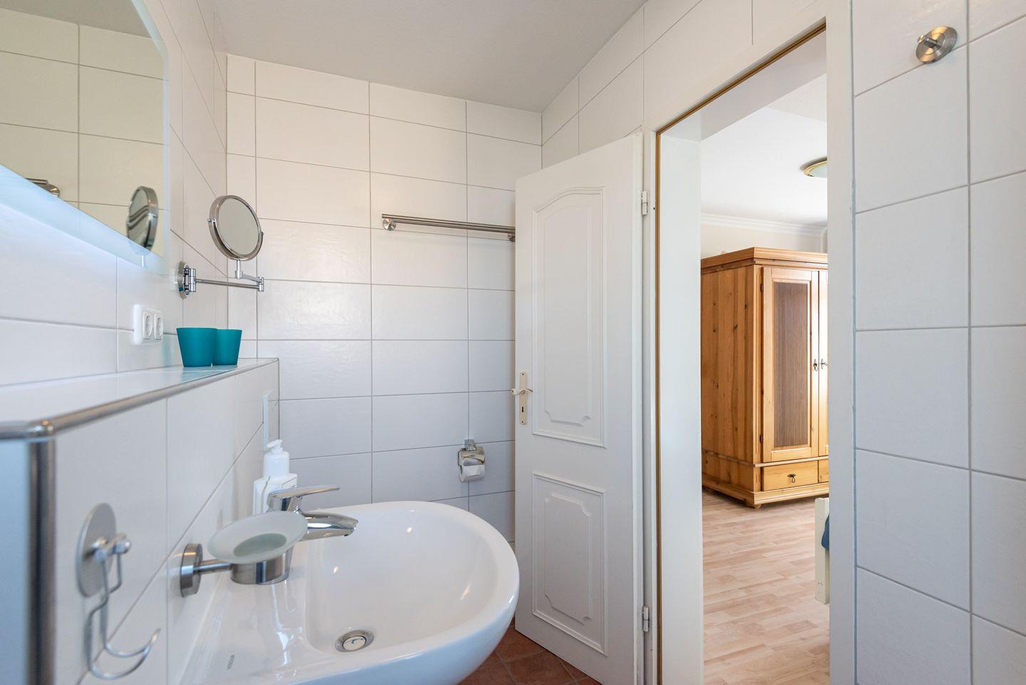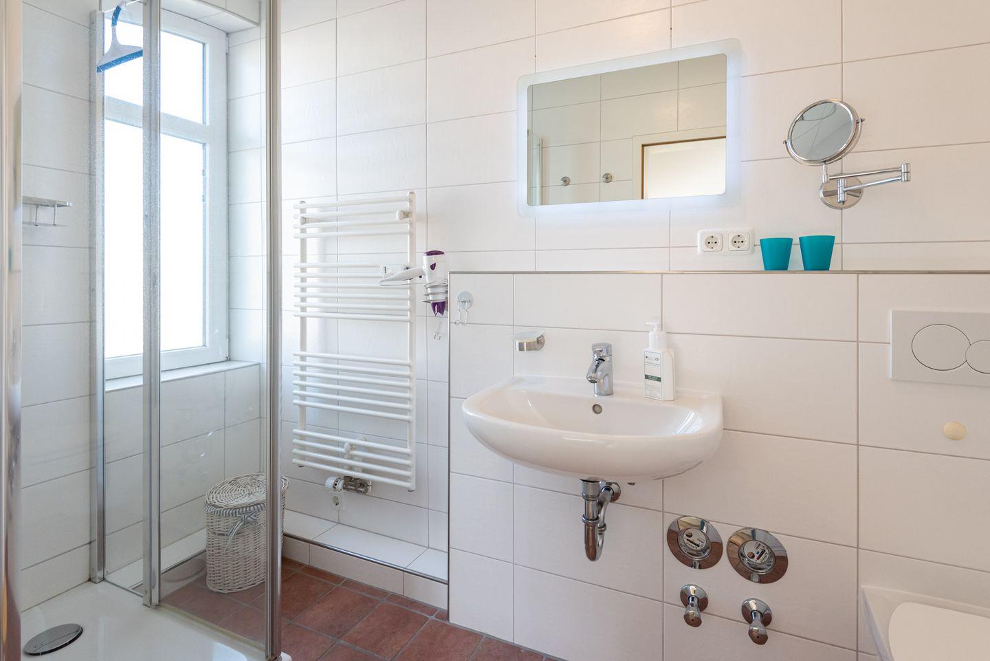 Badezimmer: Das moderne, helle Duschbad mit WC und Fenster grenzt direkt an das Schlafzimmer an.