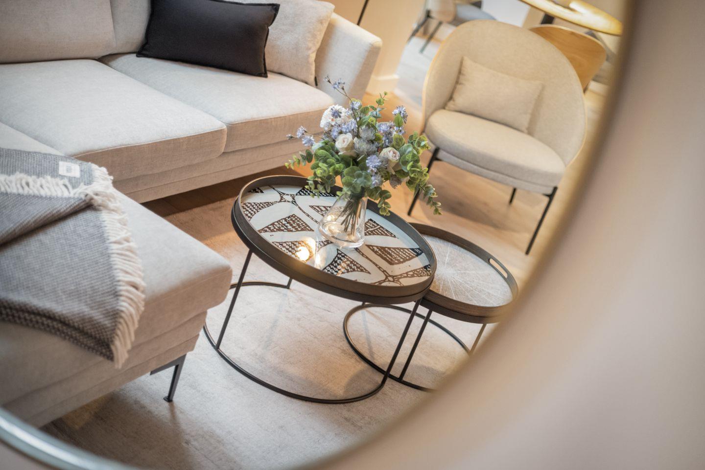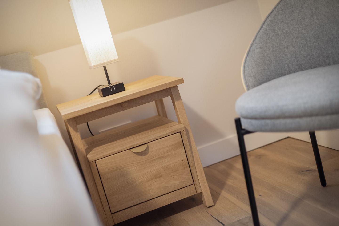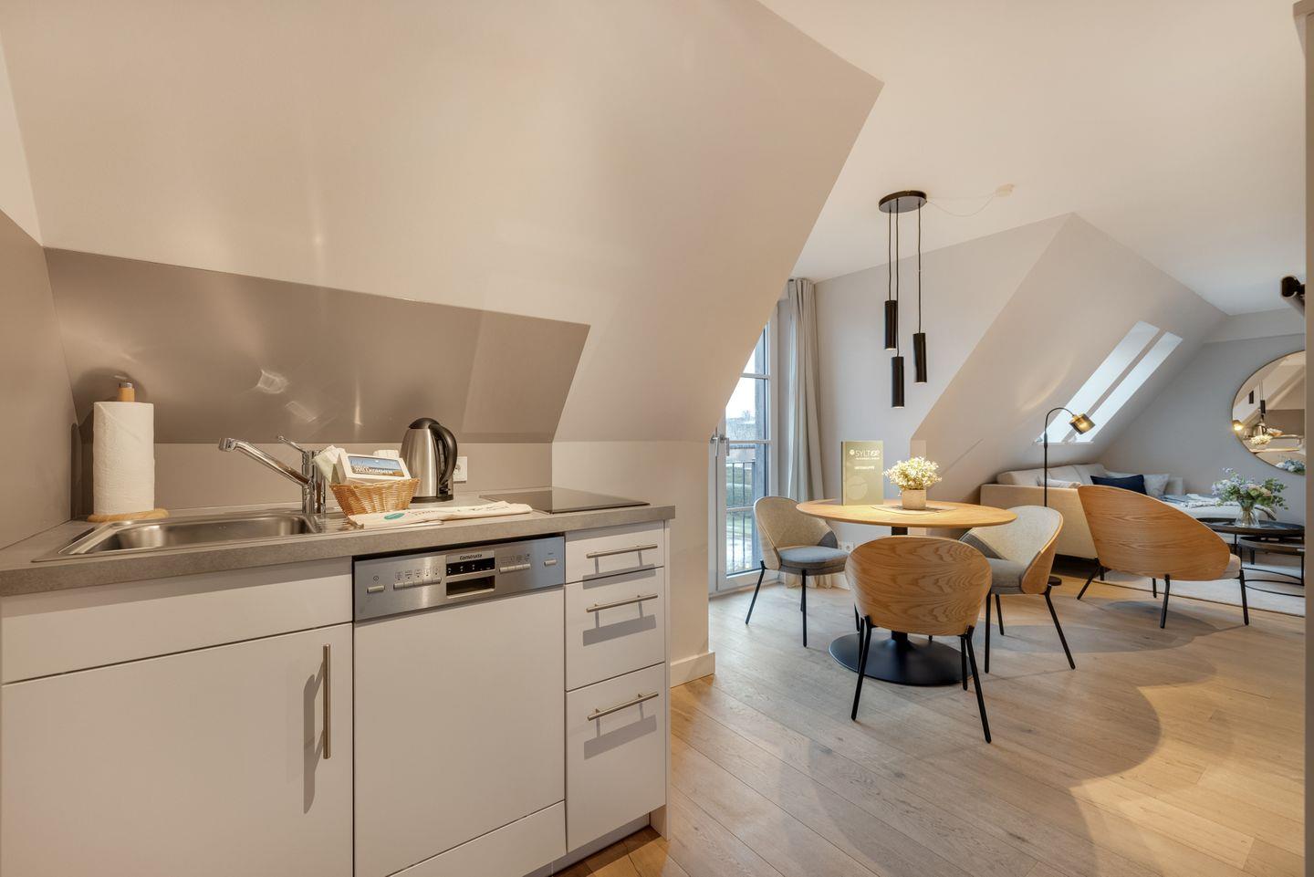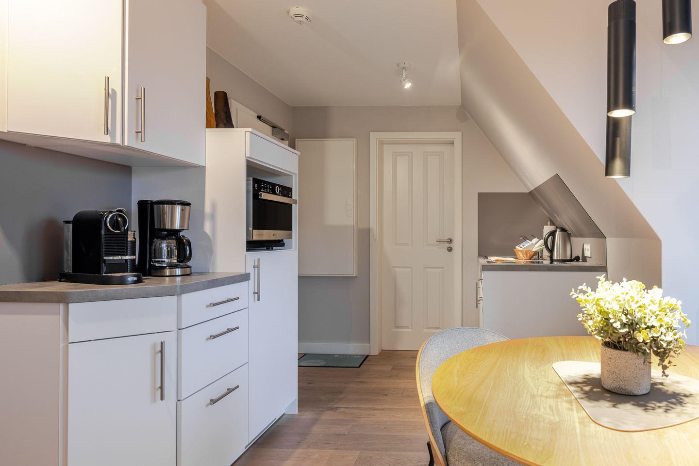 Dieses Appartement liegt im Obergeschoss über zwei Ebenen, ist durch die großen Fenster schön hell und nach Süden ausgerichtet. Zum Arbeiten steht ein Schreibtisch zur Verfügung. Das Wohnzimmer wurde im Dezember 2025 komplett neu eingerichtet.