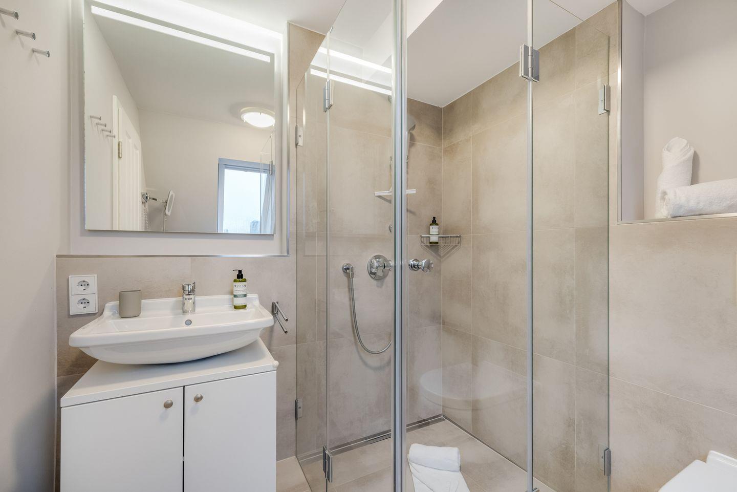 Badezimmer 1: Modernes Bad mit Dusche, WC und Fenster.