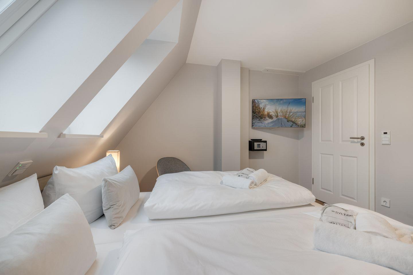 Schlafzimmer: Doppelbett, hochwertige Möbel, TV sowie ein großes Fenster.