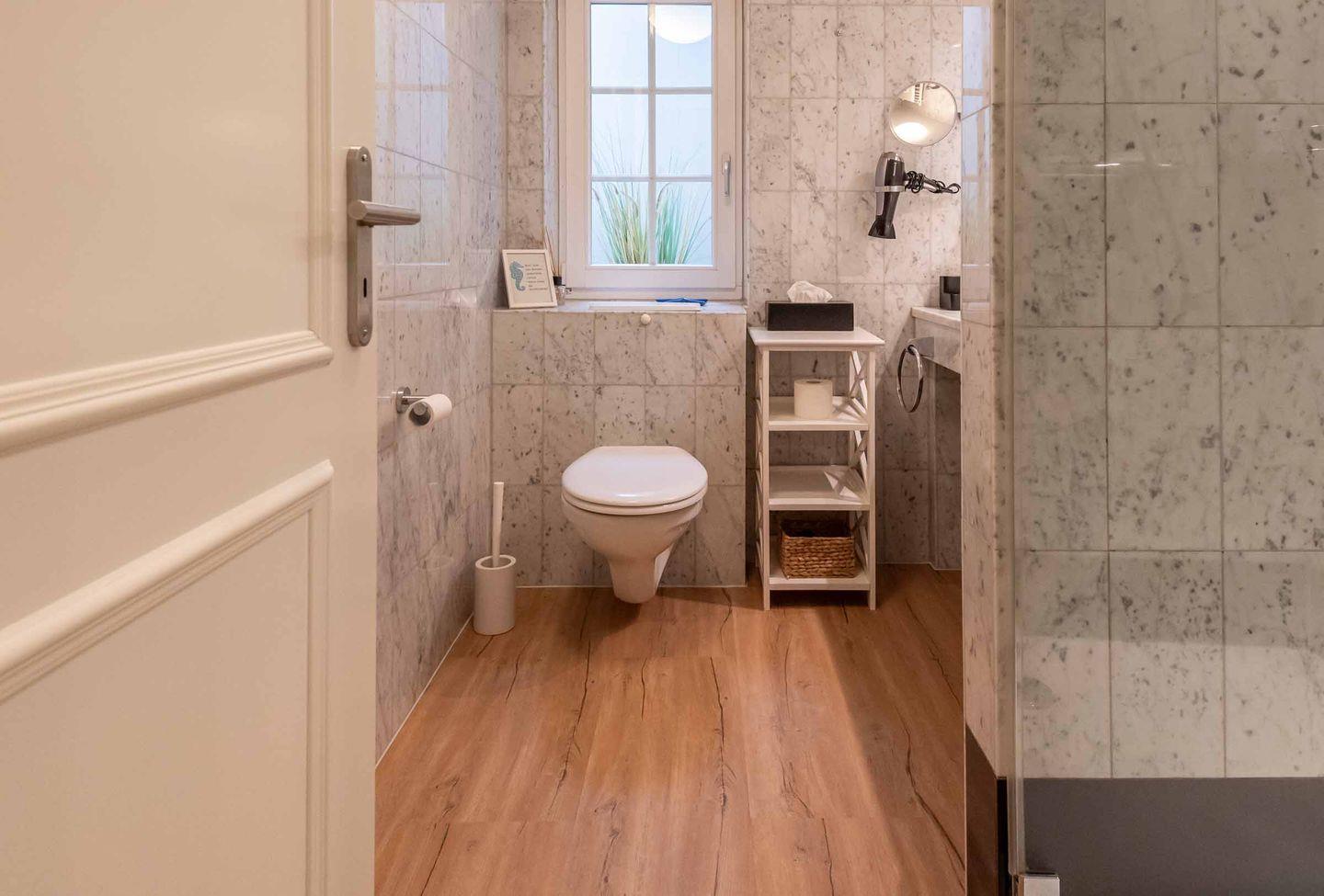 Badezimmer: Helles Bad mit Dusche, WC und Fenster.