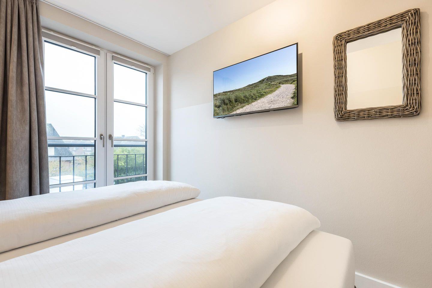 Schlafzimmer: Doppelbett, hochwertige Möbel, TV sowie ein großes Fenster.
