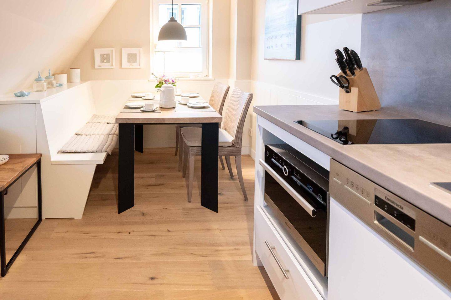 Koch-/Ess-/Wohnbereich: Neben einer kleinen Küchenzeile mit Mikrowelle befindet sich ein Essplatz für 4 Personen. Zudem vervollständigt die komfortable Sofaecke inklusive Flatscreen-TV den Wohnbereich.