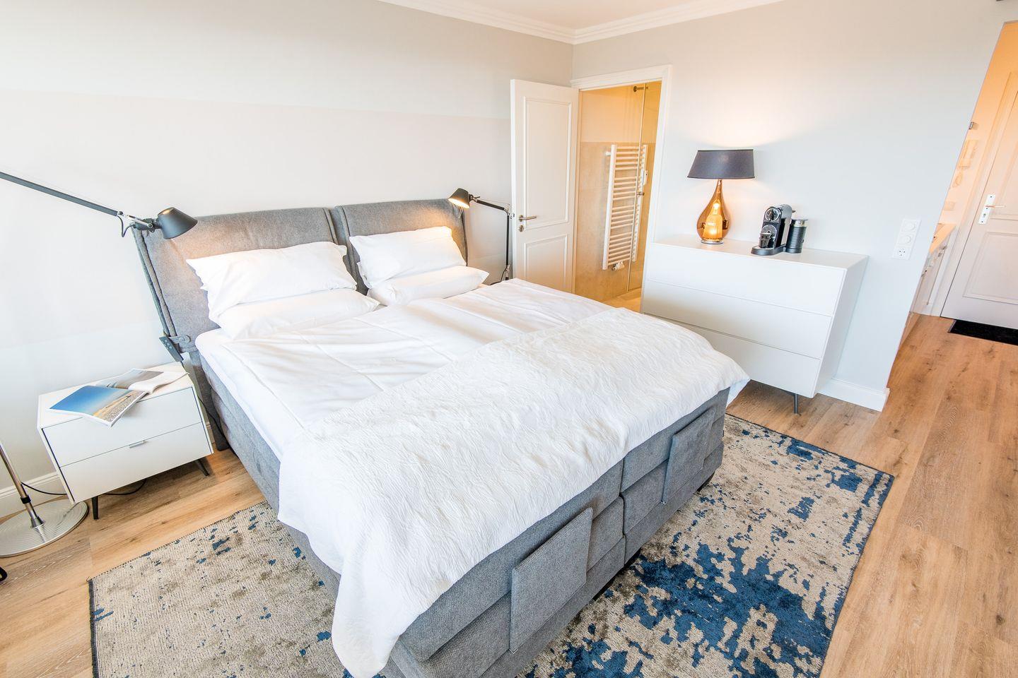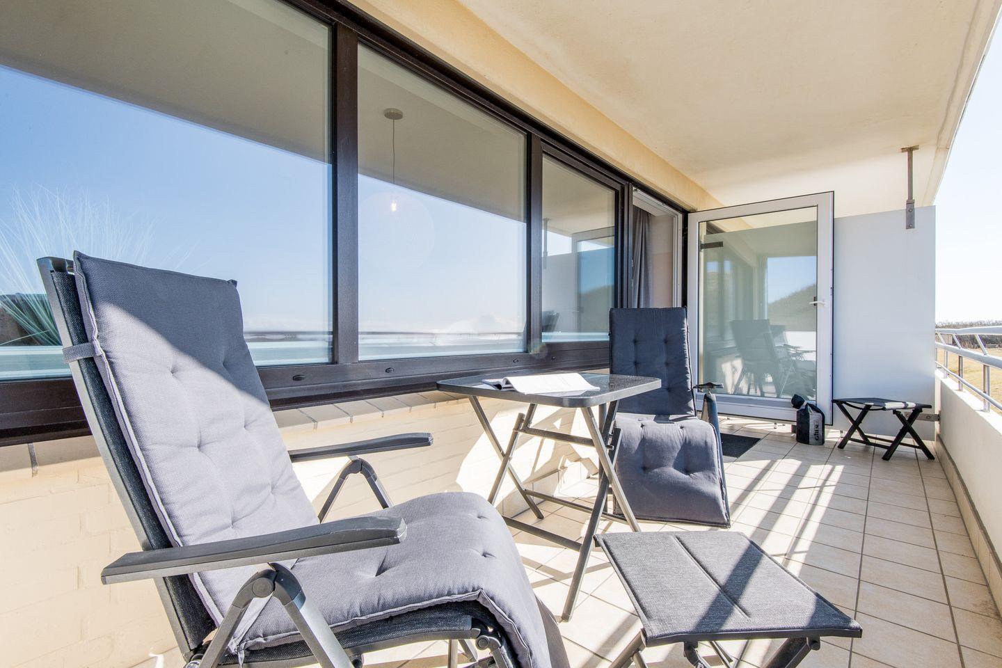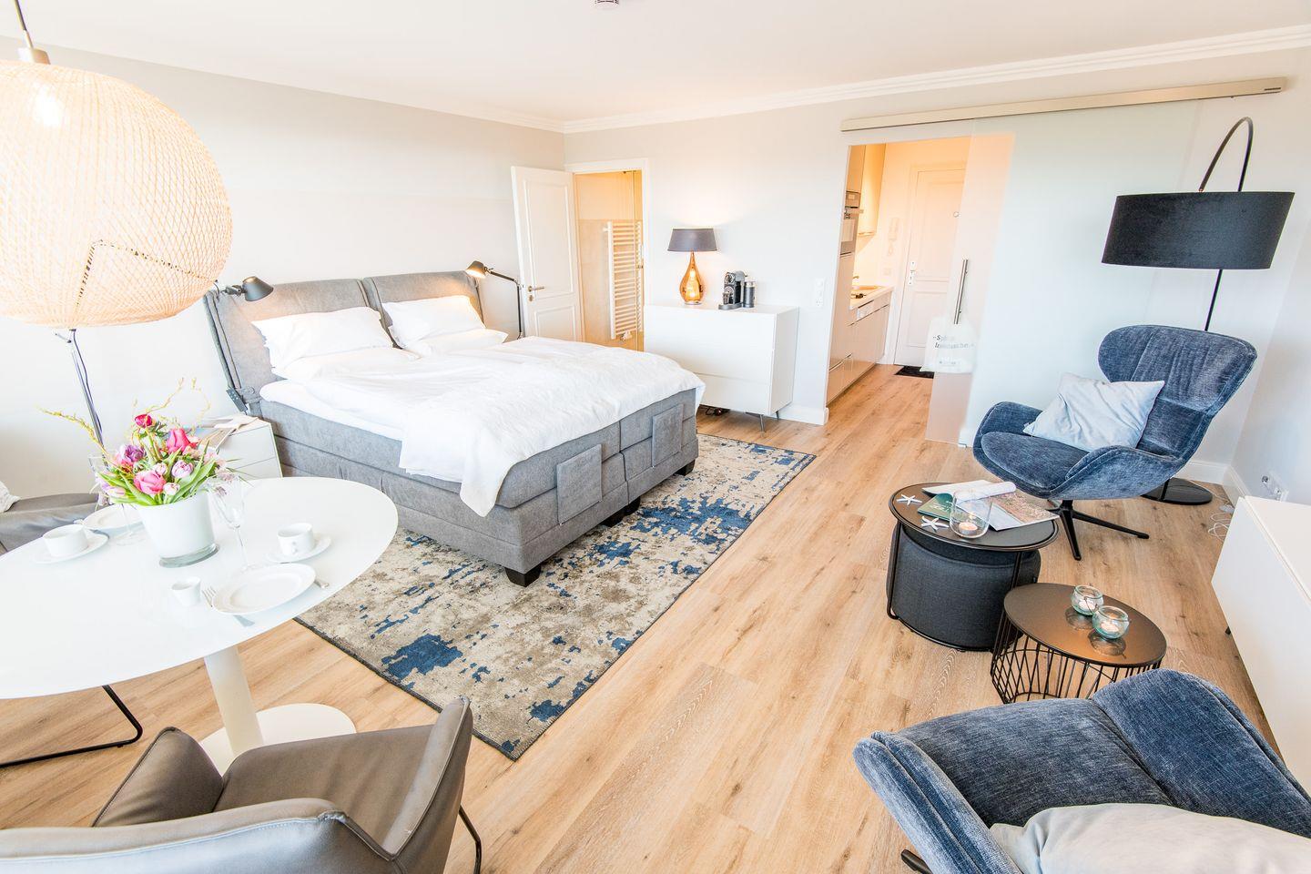 Wohn-/Schlaf-/Essbereich: Der helle Wohnbereich mit Flatscreen-TV bietet neben einer gemütlichen Sitzgruppe und schönem Essbereich, der mit Blick zum Meer zum Verweilen einlädt. Neues und modernes Boxspringbett für 2 Personen. Über die gesamte Wohnbreite liegt der große Balkon mit dem atemberaubenden Blick auf die Nordsee.