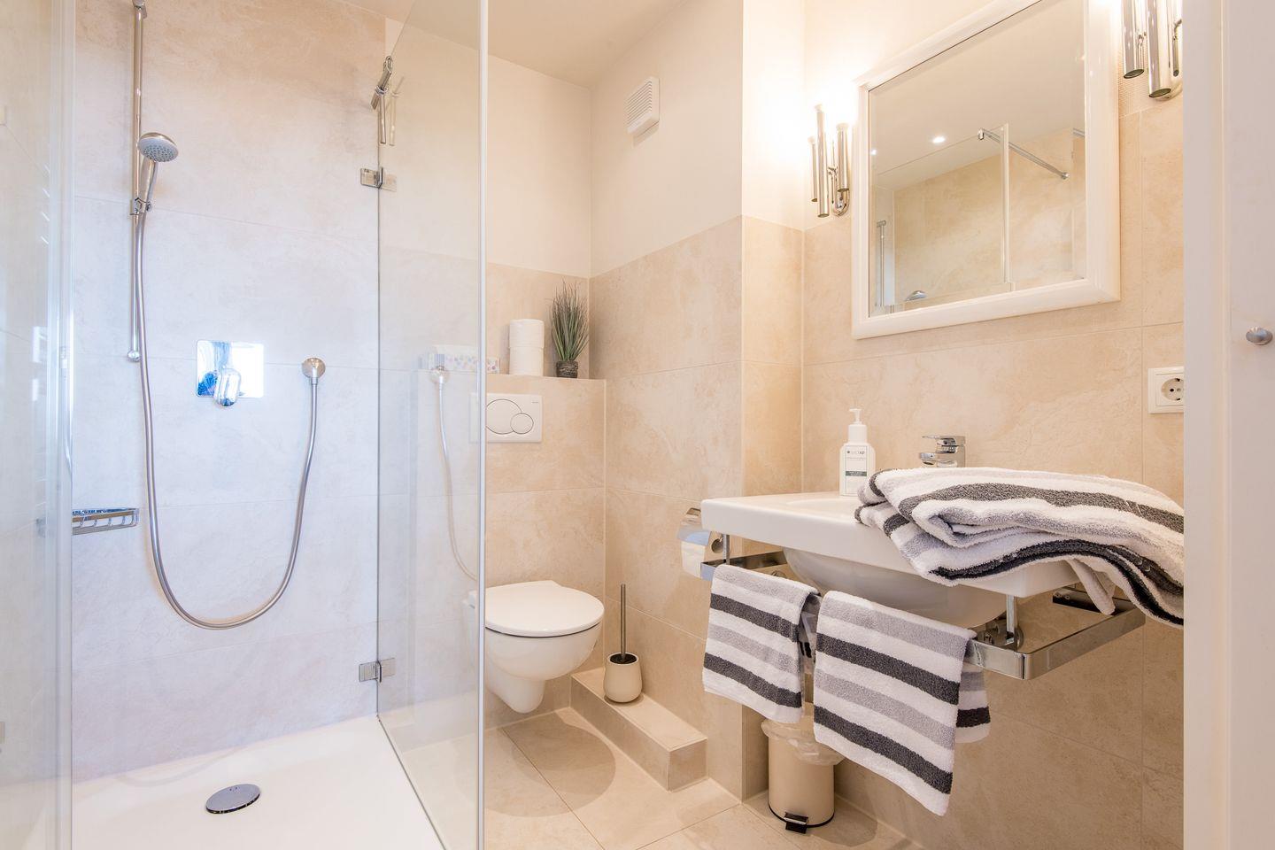 Badezimmer: Das modern gestaltete und geräumige Duschbad grenzt direkt an das Wohn-/Schlafzimmer.