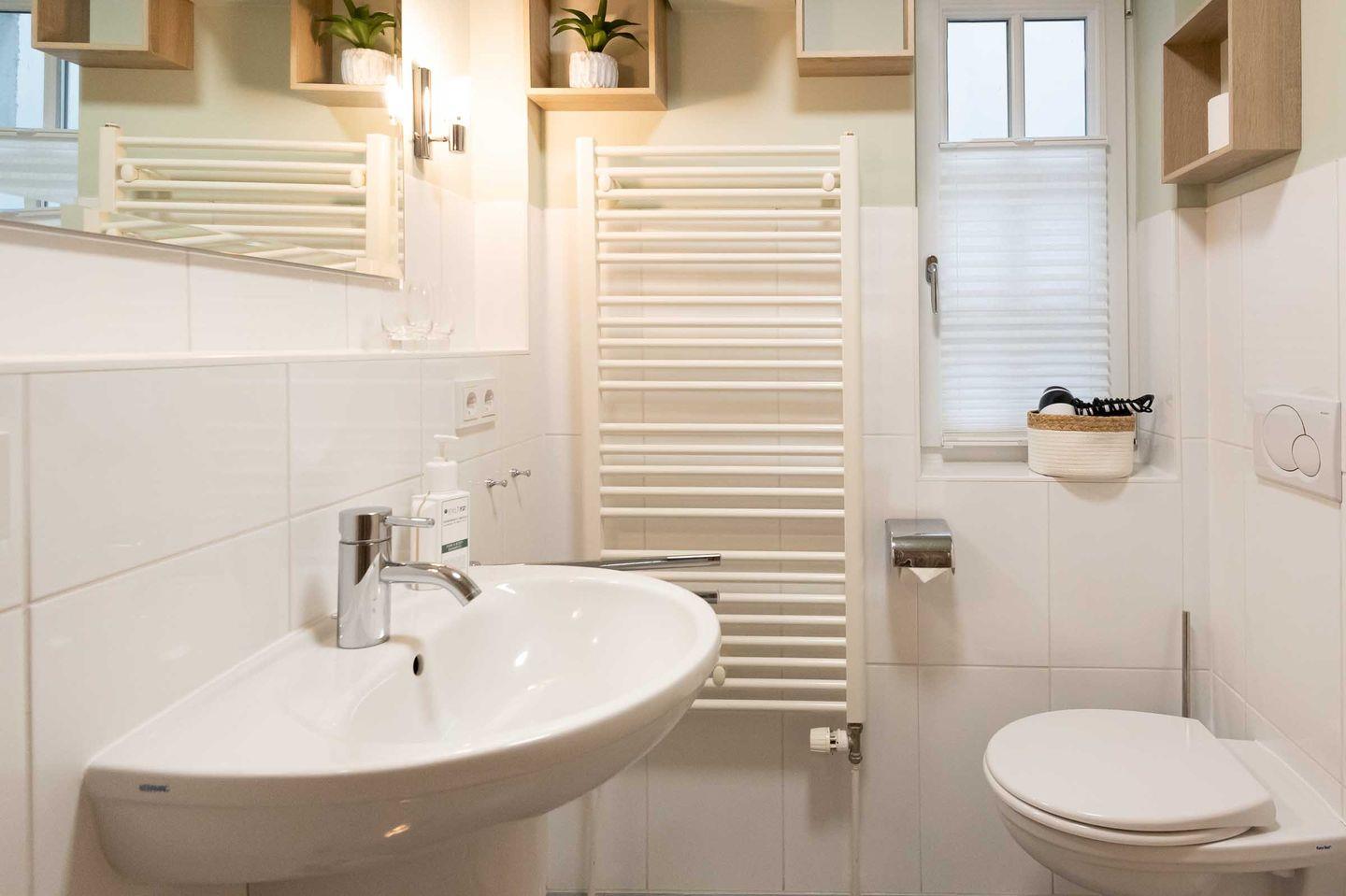 Badezimmer 1: Helles Duschbad mit WC und Fenster.