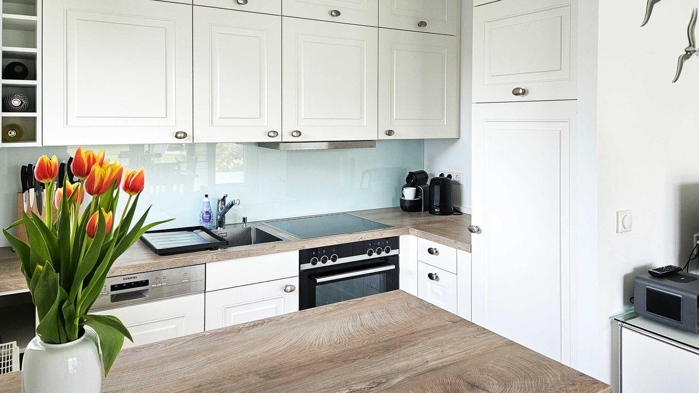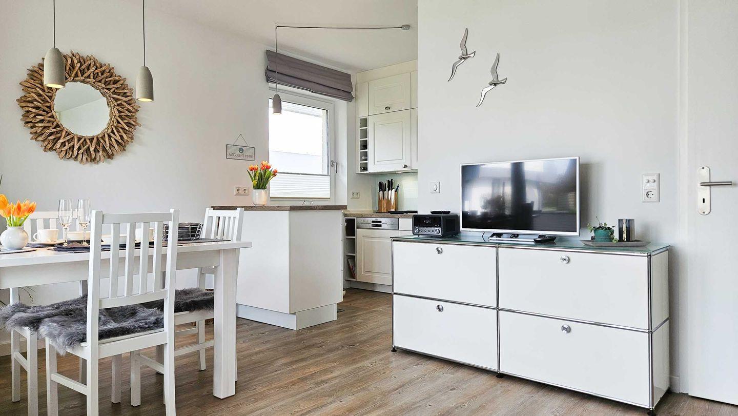 Wohn-/Koch-/Essbereich: Im lichtdurchfluteten Wohnbereich wurde eine Küche integriert und mit einer Essecke im Landhausstil versehen. Der moderne Sitzbereich mit TV und Internet-Radio wurde im Zuge der Renovierung neu gestaltet und lädt zum Verweilen ein. Die großzügige und herrlich gelegene Süd-West Terrasse wurde mit einem Strandkorb und Gartenmöbeln ausgestattet, um die Sonne und Ruhe in vollen Zügen genießen zu können. Ein überdachter Terrassenteil bietet Schatten und Schutz bei Regen.