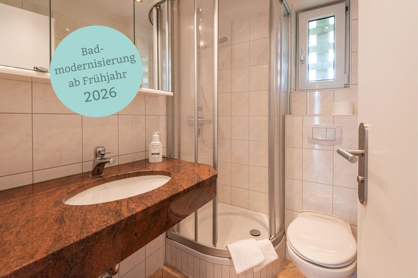 Badezimmer: Freundliches Badezimmer mit Dusche, WC und Fenster.