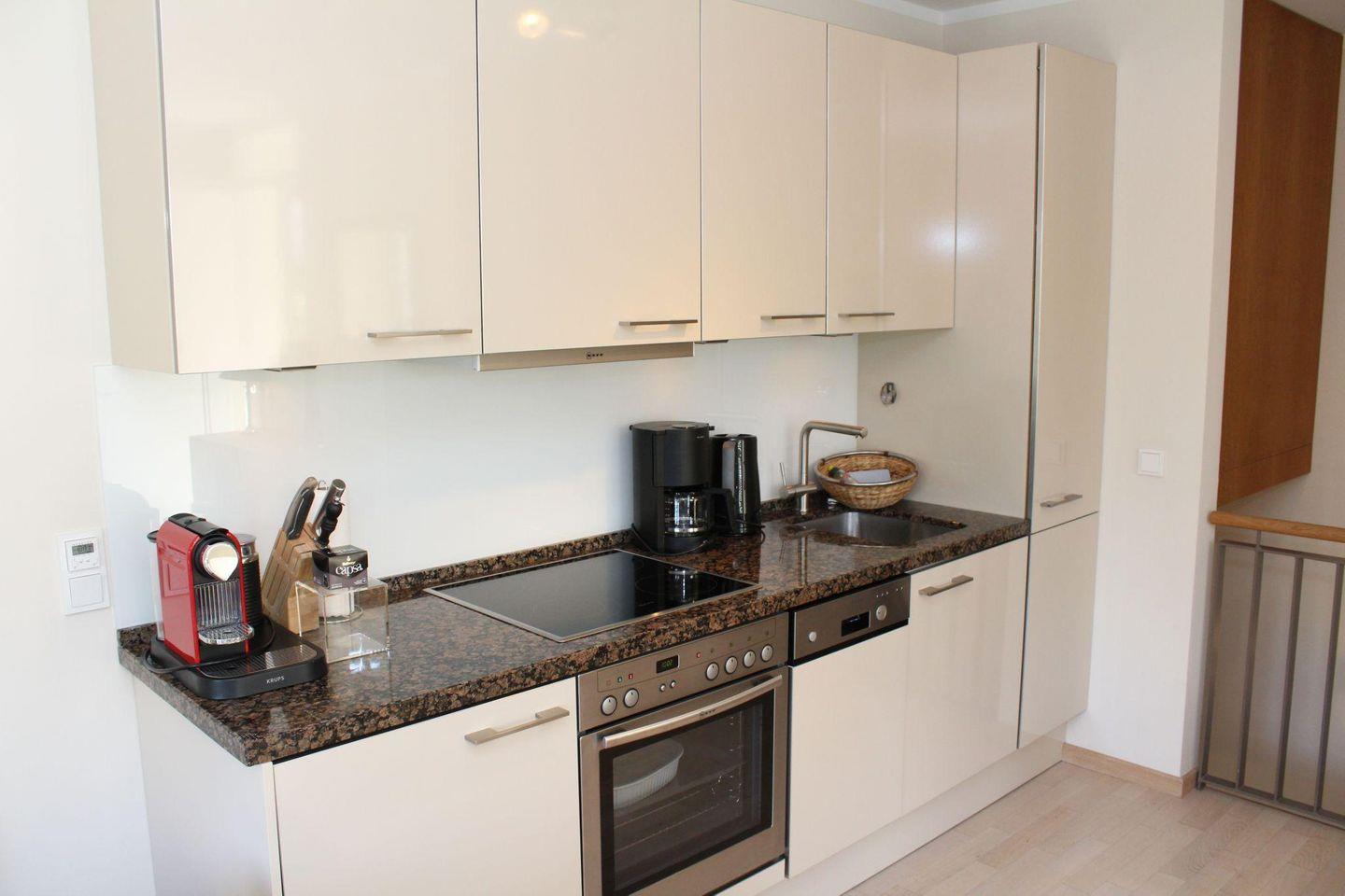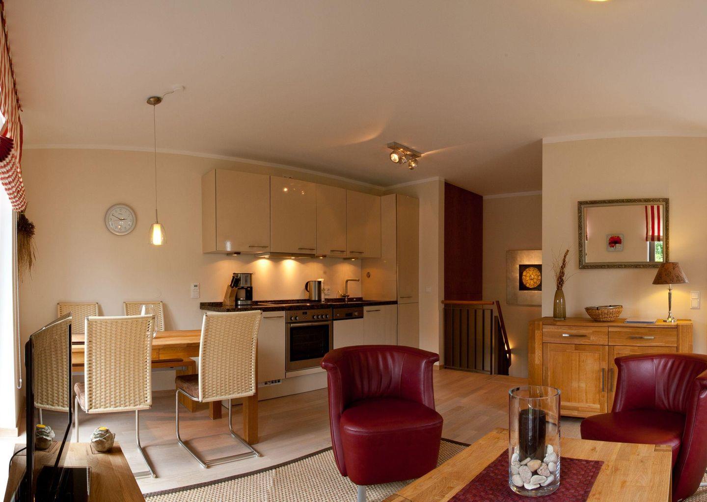 Koch-/Wohn-/Schlaf-/Essbereich: Modernes Einrichtungsdesign mit vielen Annehmlichkeiten, wie der ausziehbaren edlen Schlafcouch. Die komfortable Küche, der gemütliche Esstisch und der große TV sorgen für einen Wohlfühlfaktor. Von hier gelangen Sie auf die beiden Terrassen, die mit schönen Gartenmöbeln und einem Saison-Strandkorb ausgestattet wurden.