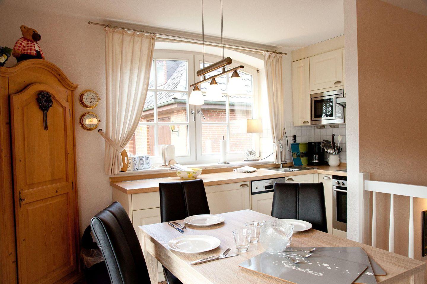 Wohn-/Koch-/Essbereich: In dem modernen Wohn- und Essbereich finden Sie eine voll ausgestattete Küche und eine gemütliche Ess- und Sofecke mit einem schönen Kaminofen. Von hier aus gelangen Sie auch auf die herrliche Süd-/Westterrasse mit Strandkorb und geschmackvollem Mobiliar.