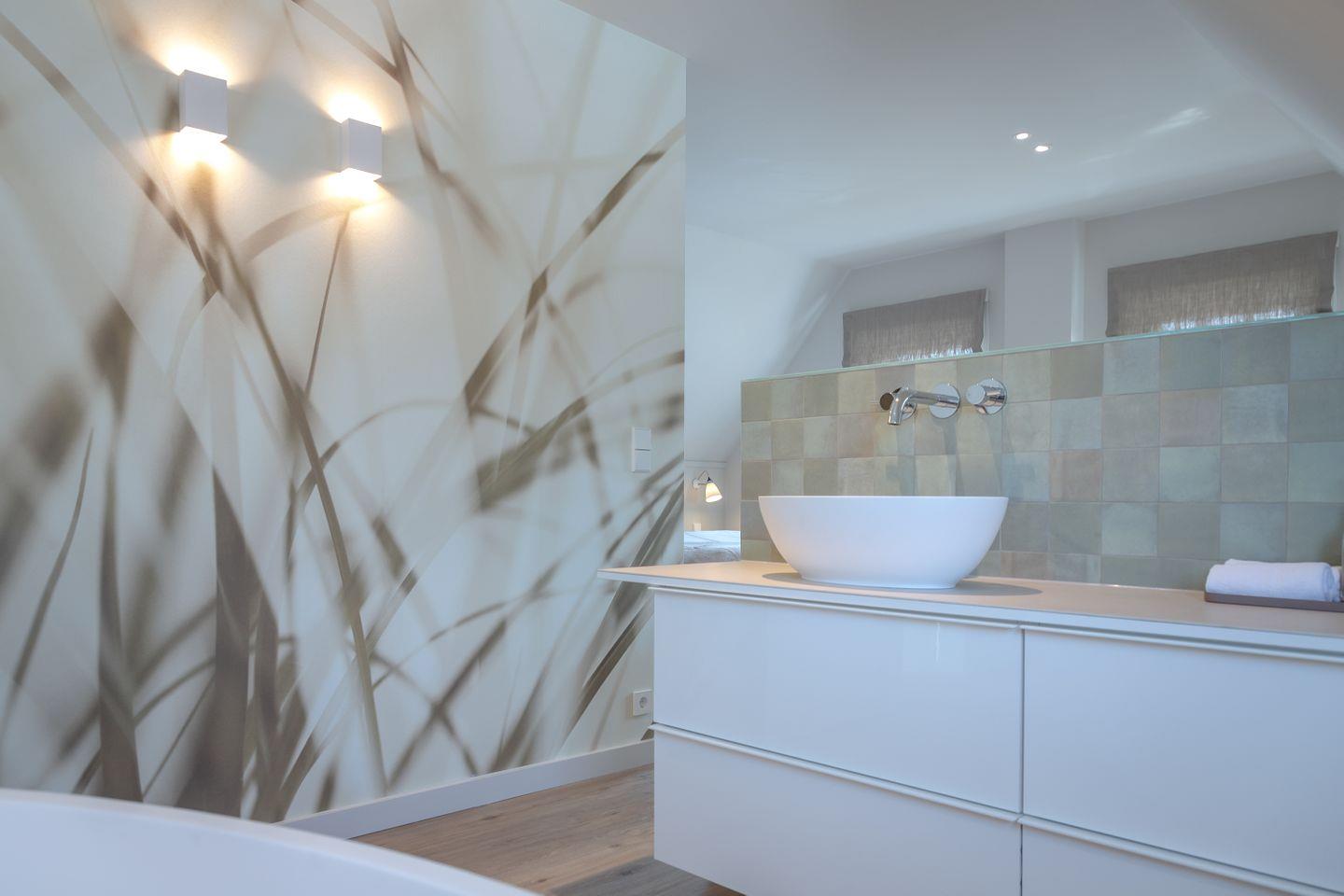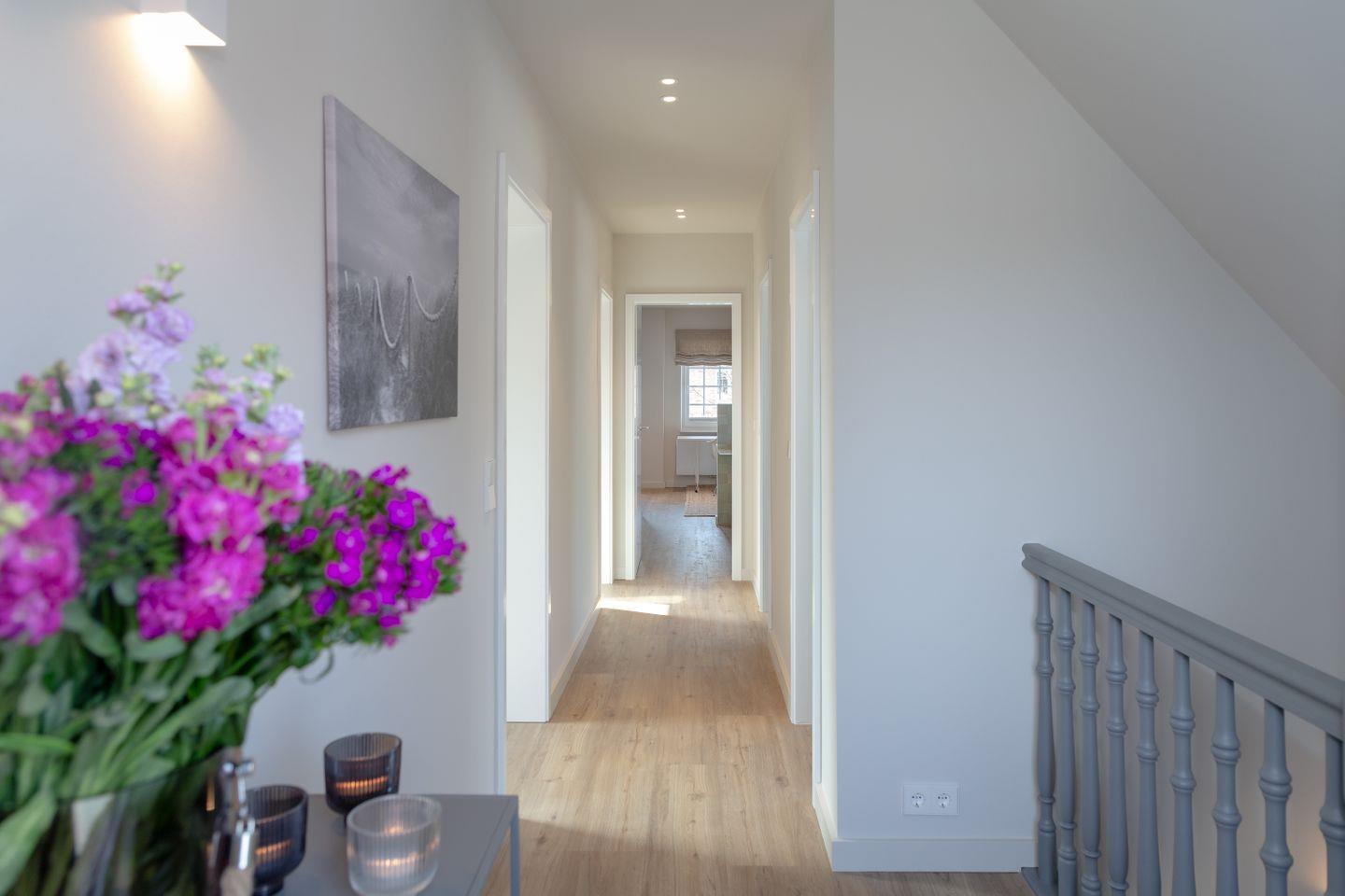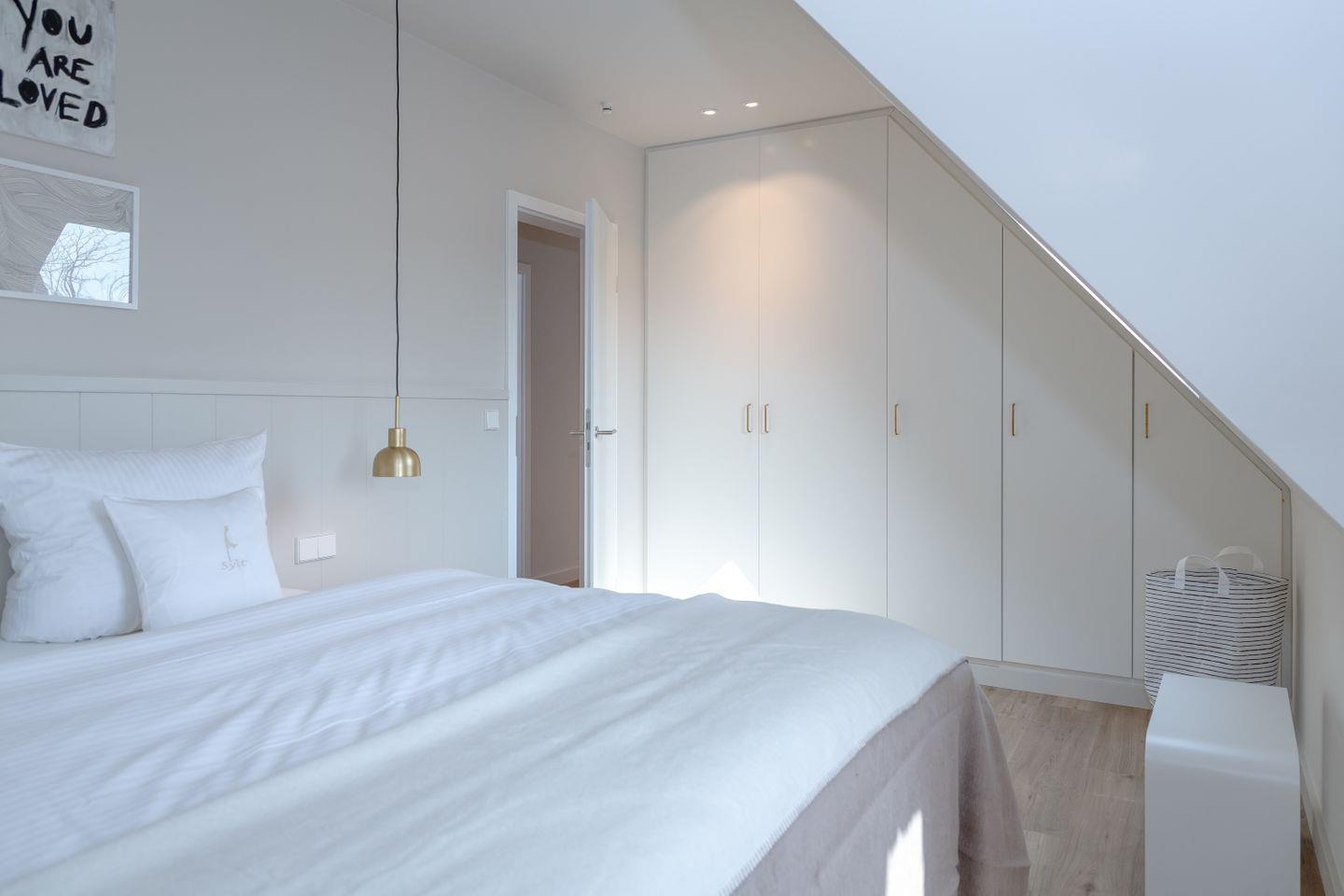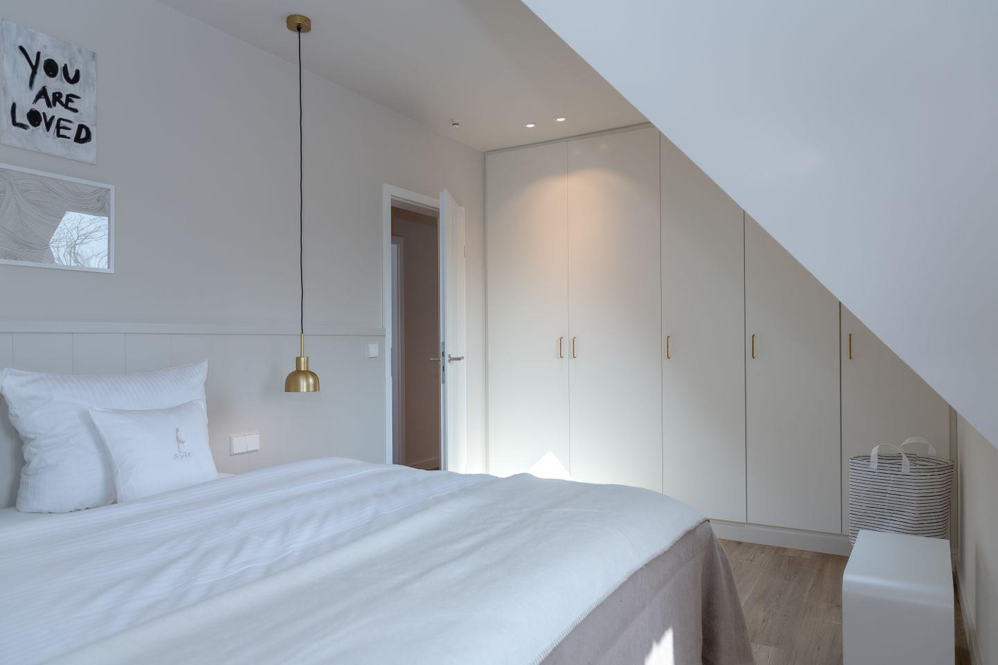Ein Schlafzimmer (Bett 1,80 x 2,00m) und ein großes Badezimmer mit Dusche befinden sich im Erdgeschoss. Drei weitere Schlafzimmer sowie zwei Badezimmer mit Dusche sind im Obergeschoss untergebracht. Der große Master-Bedroom (Bett 1,80 x 2,00m), verfügt über eine freistehende Badewanne und ist somit zugleich eine edle Wellness-Oase. Zudem ist im Master-Bedroom ein Arbeitsbereich mit Schreibtisch eingerichtet.