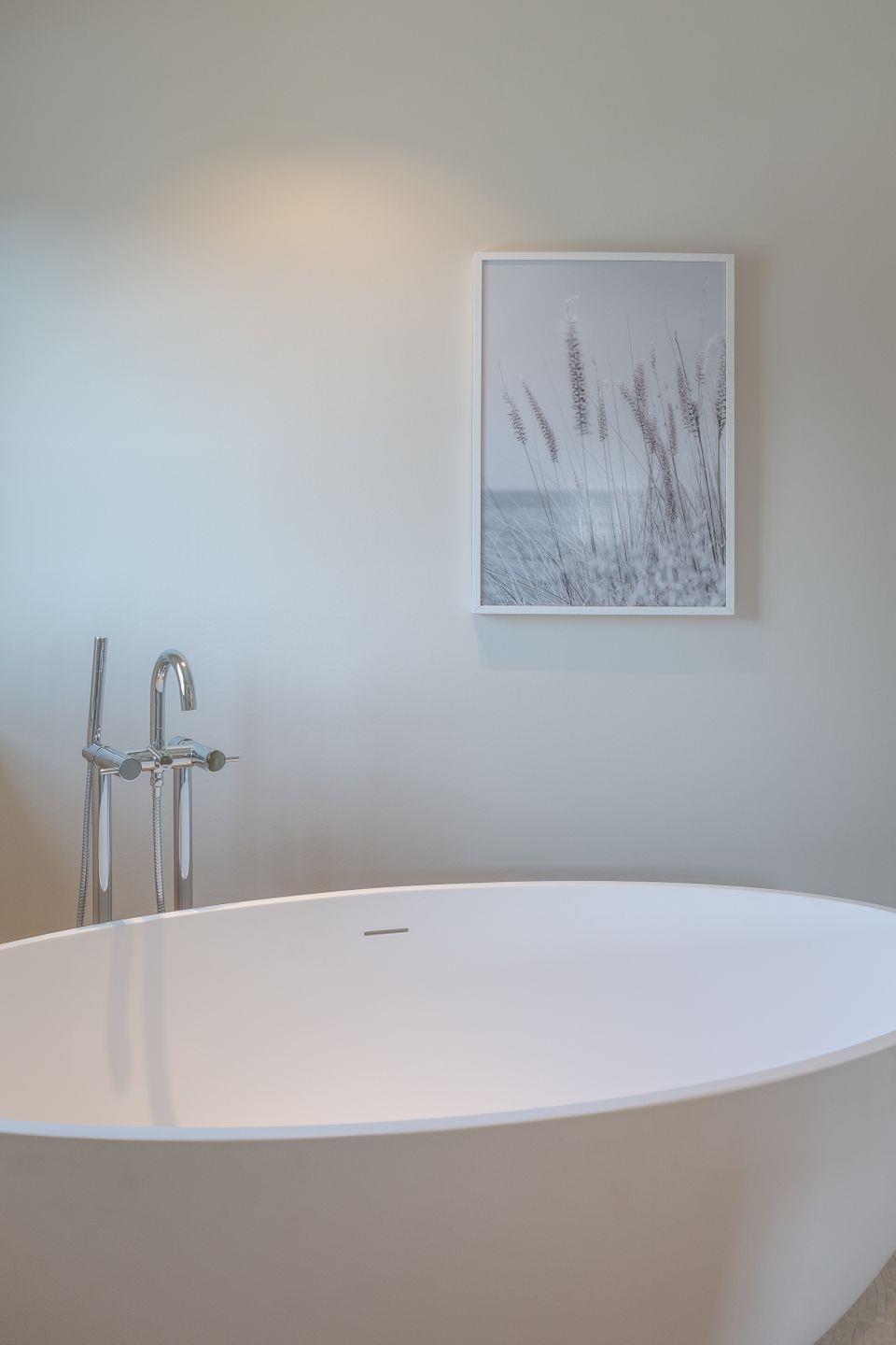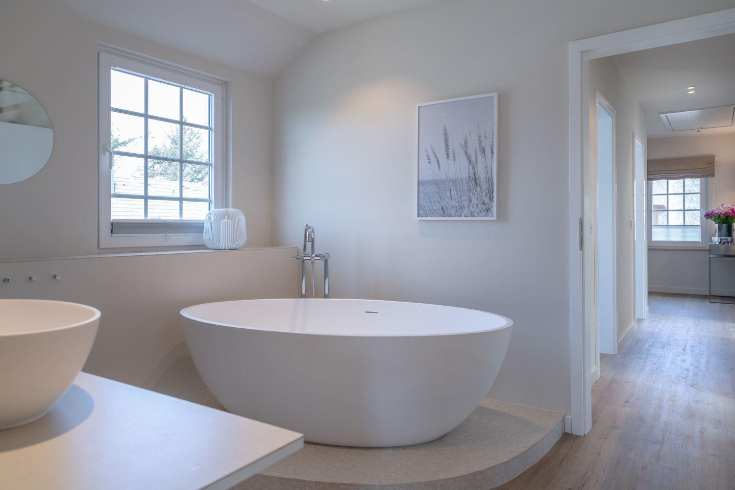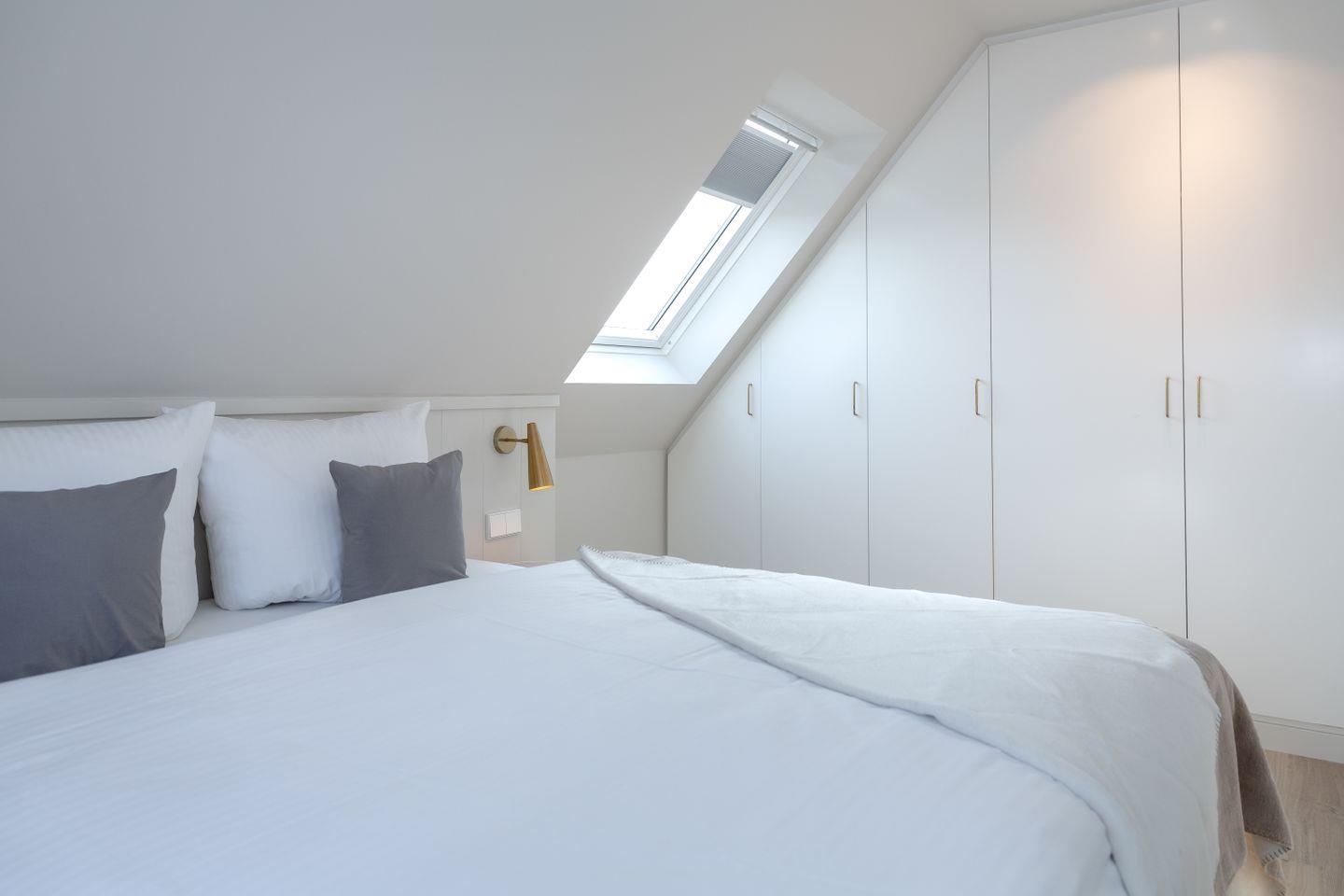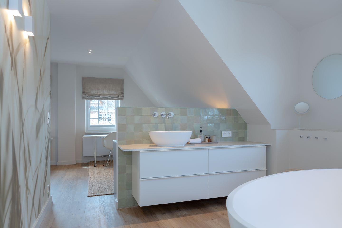 Ein Schlafzimmer (Bett 1,80 x 2,00m) und ein großes Badezimmer mit Dusche befinden sich im Erdgeschoss. Drei weitere Schlafzimmer sowie zwei Badezimmer mit Dusche sind im Obergeschoss untergebracht. Der große Master-Bedroom (Bett 1,80 x 2,00m), verfügt über eine freistehende Badewanne und ist somit zugleich eine edle Wellness-Oase. Zudem ist im Master-Bedroom ein Arbeitsbereich mit Schreibtisch eingerichtet.