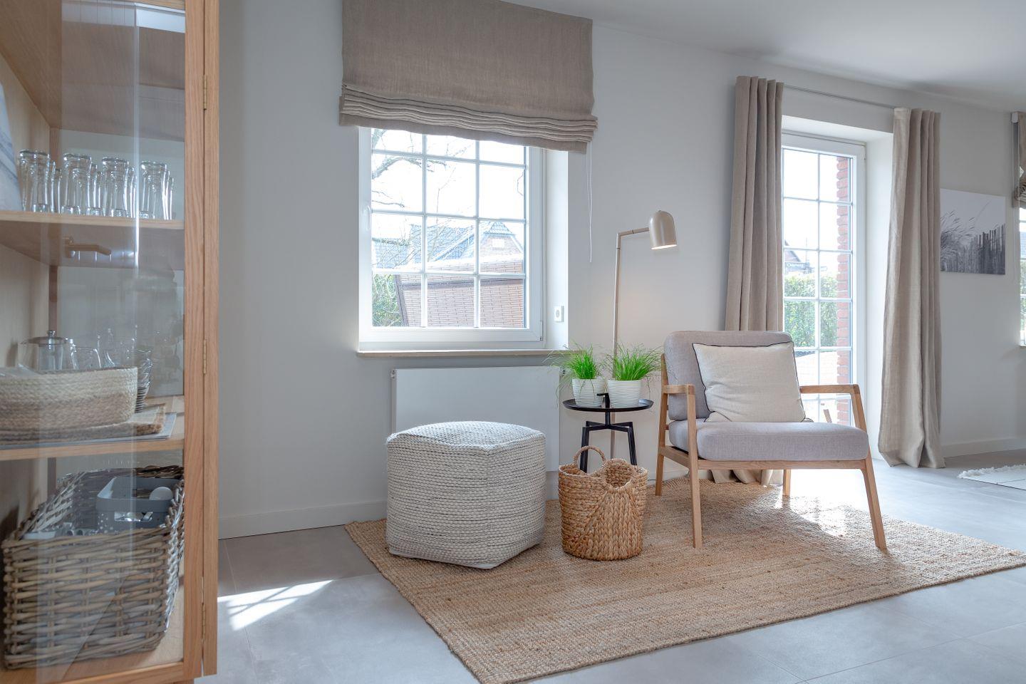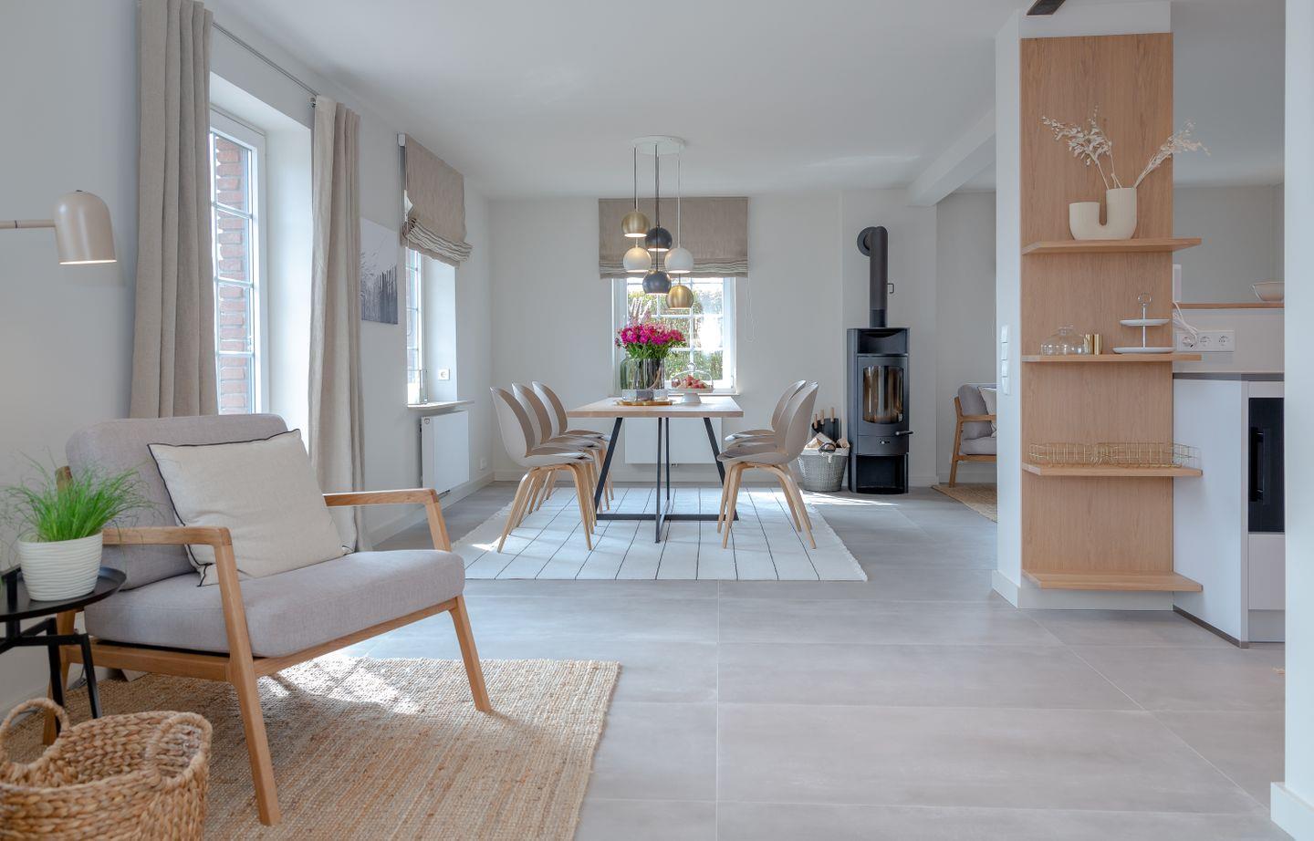Der großzügige Wohnbereich lädt mit einem gemütlichen, Sofa und Sessel und Leseecke zum Entspannen ein. Am großen Esstisch findet die ganze Familie oder Freunde zusammen. Der schwenkbare Ofen gibt ein wohliges Ambiente zum Ess- oder Wohnbereich.