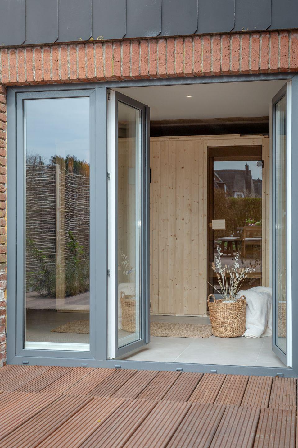 Im Anbau befindet sich die Sauna mit Duschbereich und Ruheliegen zum Entspannen. Eine Außendusche macht den ganz persönlichen Wellness-Bereich perfekt.