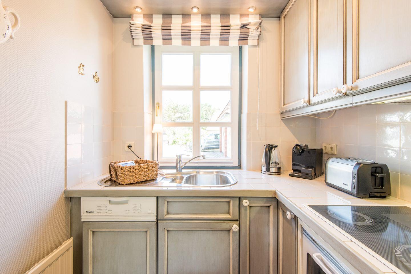 Wohn-/Koch-/Essbereich: Gut ausgestattete Landhausküchenzeile mit angrenzendem Essenbereich mit Platz für bis zu 4 Personen. Der gemütliche Wohnbereich lädt mit TV, Sofaecke und Sessel zum Verweilen ein. Vom Wohnbereich haben Sie Zutritt auf die möblierte Südterrasse mit eigenem Strandkorb.