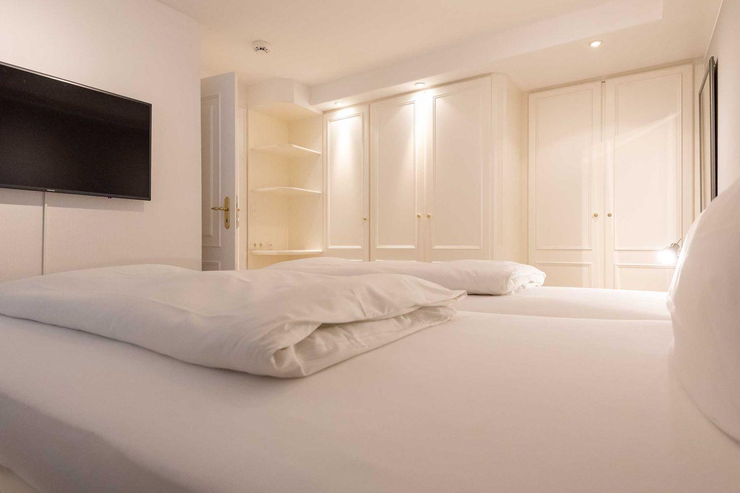 Schlafzimmer 1: Doppelbett, Kleiderschrank, TV und Fenster.