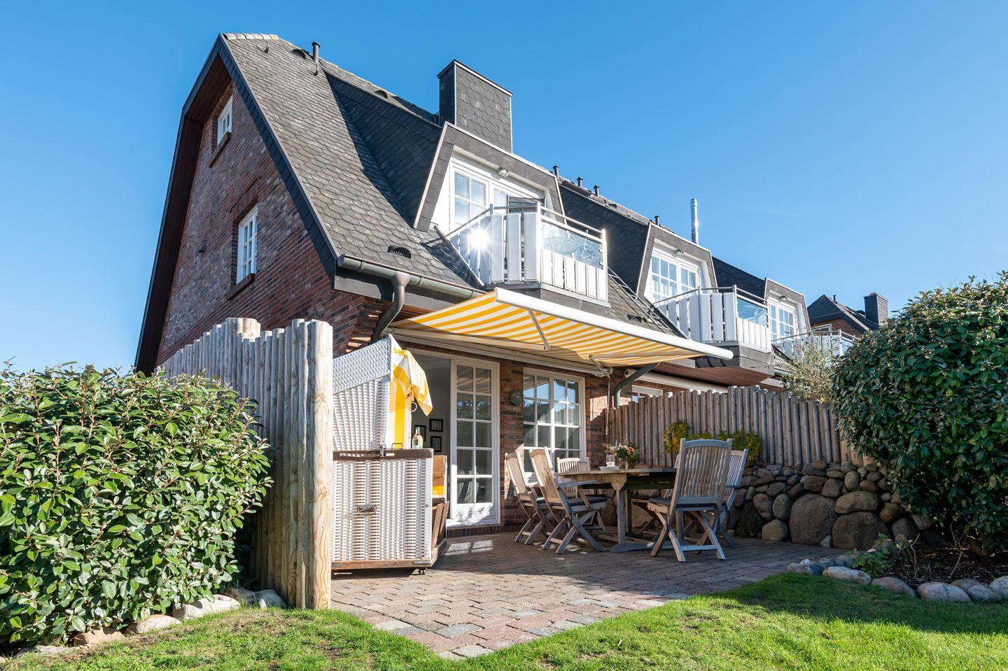 Über eine Terrassentür gelangen Sie vom Wohnzimmer aus auf die sonnige und möblierte Süd-Terrasse mit Saisonstrandkorb, Sonnenschirm und Markise.