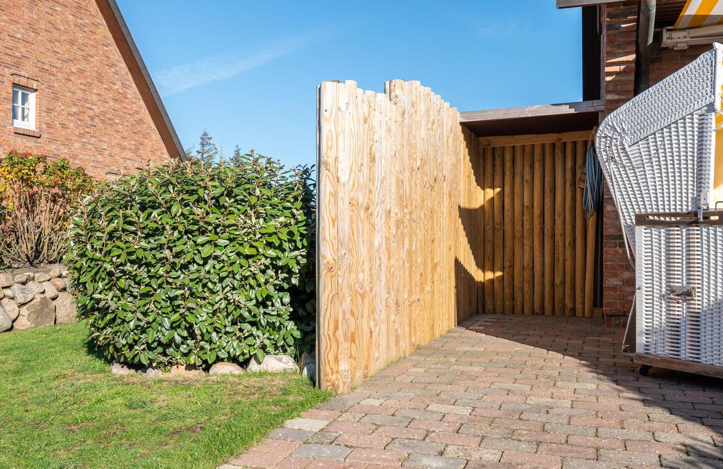 Eine teilüberdachte Ecke (s. Foto) am Rande der Terrasse, die von Palisaden zum Grundstück abgetrennt ist, eignet sich hervorragend um Fahrräder abzustellen.
